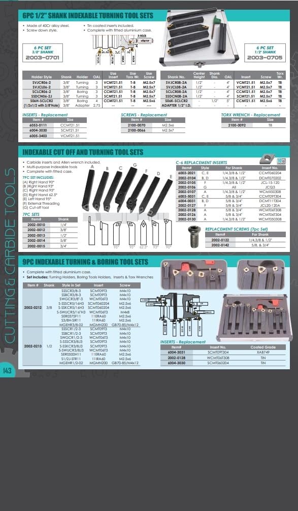 HHIP 5/8" 5 Piece Indexable Carbide Turning Tool Set ~ Set # ST-10 ~ One of each - AR, AL, BR, BL & E holders. ~ C-5 Inserts in each holder. ~ 5 pieces of spare screws. ~ 2 L-wrenches. ~ Use with TPGH & TCMT style inserts with 3/8" I.C. ~ Our replacement inserts include our #'s 2003-0014, 6025-1321, 6025-1322, 6025-0014, 2003-0023, 6025-2321, 6025-2322 or 6004-9031 depending on what you need.
