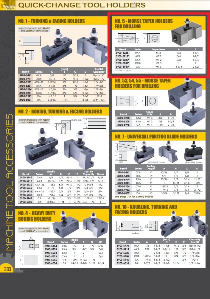 HHIP No. 5 MT2 tool holder for 0XA Tool Posts (3900-5926). Interchangeable with Aloris and DORIAN same series tool posts. All working parts are hardened and ground. Increases productivity for all lathe operations. A is 1/2". B is 1-1/4".