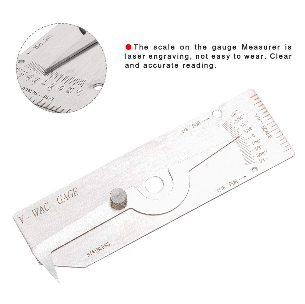 High quality Hi Lo Welding Gauge Gage, V-WAC Single Weld Gage and MG-8 Bridge Cam Gage kit: Made of stainless steel, not easy to rust and bend, light in weight, mini size, easy to carry, long service life The scale on the gauge Measurer is laser engraving, not easy to wear, Clear and accurate reading The locking screw can fix the pointer in position to read and record the measurement results easily Hi Lo Welding Gauge Gage: Useful for Measure internal misalignment.Measure fit- up gap Measure bevel on end preparation,crown height of welds,fillet leg weld throat size,scribed line, socket welds and more Both standard reading and metric reading,and standard reading on one side of the gauge, metric reading on the opposite side Simply remove gauge body, turn scales over and replace body to change standard to metric Size: (Approx.) 15.8cm x 6.3cm V-WAC Biting Edge Stainless Steel Welding Gauge: Widely used to measure depth of undercut or pit, porosity comparison, weld seam, amount of porosity per linear and the height of misalignment Standard Reading: range of measurement: 0-1/4'', Increment: 1/64'' MG-8 Bridge Cam Gage Useful for the inspection of welded surfaces and joints, mainly used for measuring weld reinforcement, fillet weld leg length, fillet weld throat dimension, outside misalignment, angel of preparation,undercuts and pits and more Both standard reading and metric reading Linear measurement range: 0-2inch (0 to 60mm) Angle of preparation: 0 to 60 degree Package include: 1x Hi Lo Welding Gauge Gage 1x V-WAC Gage 1x MG-8 Bridge Cam Gage