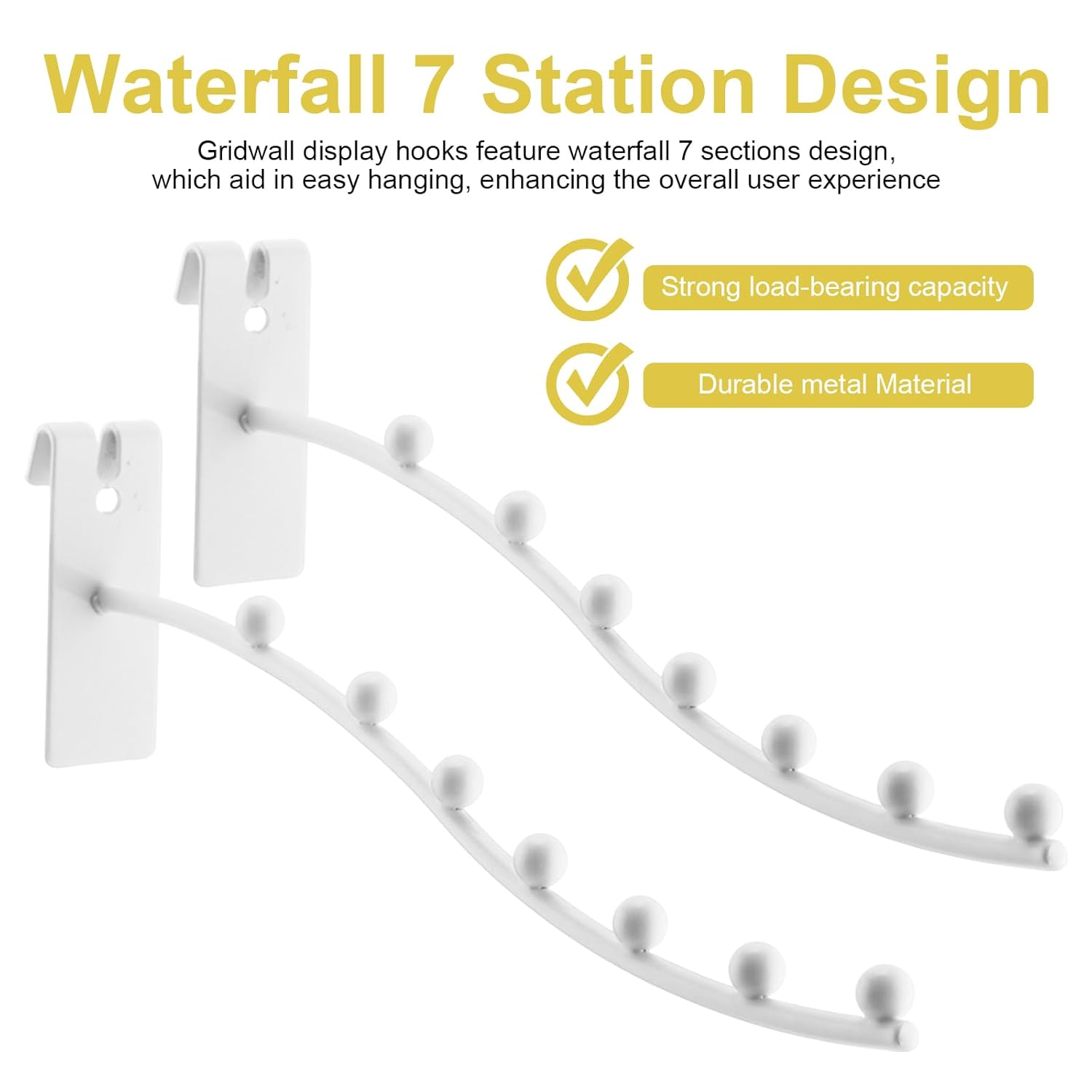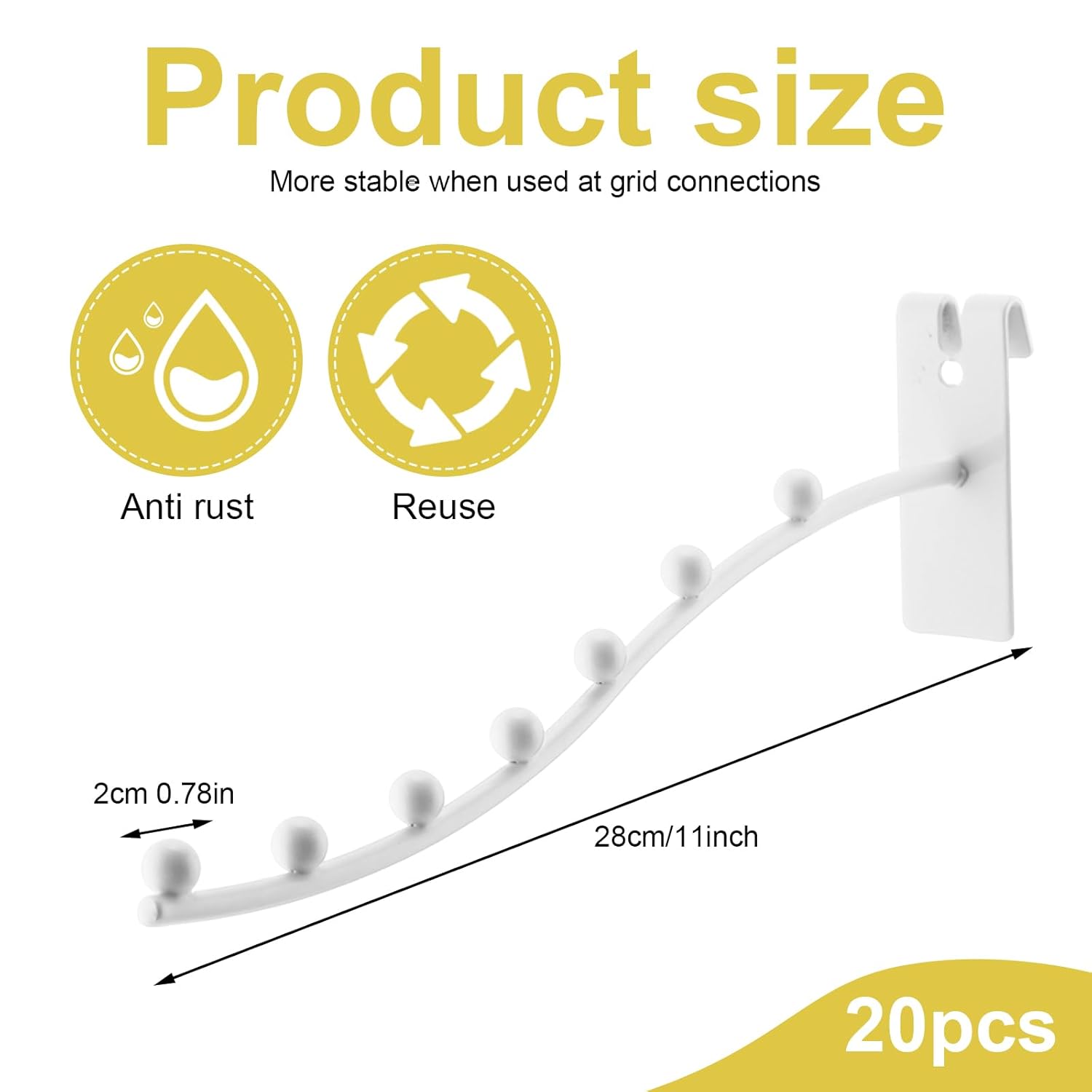 Features: Engineered for strength, these gridwall accessories securely hold weight without bending. Suitable for retail displays, warehouses, and home storage, they maintain stability even with frequent use. Specifications: Material: stainless steel Color: white Size: 10.6 inches (27 cm) Package includes: 20 x Gridwall waterfall hooks Manual measurement, please allow slight errors on size. The color may exist a slight difference due to different screen displays
