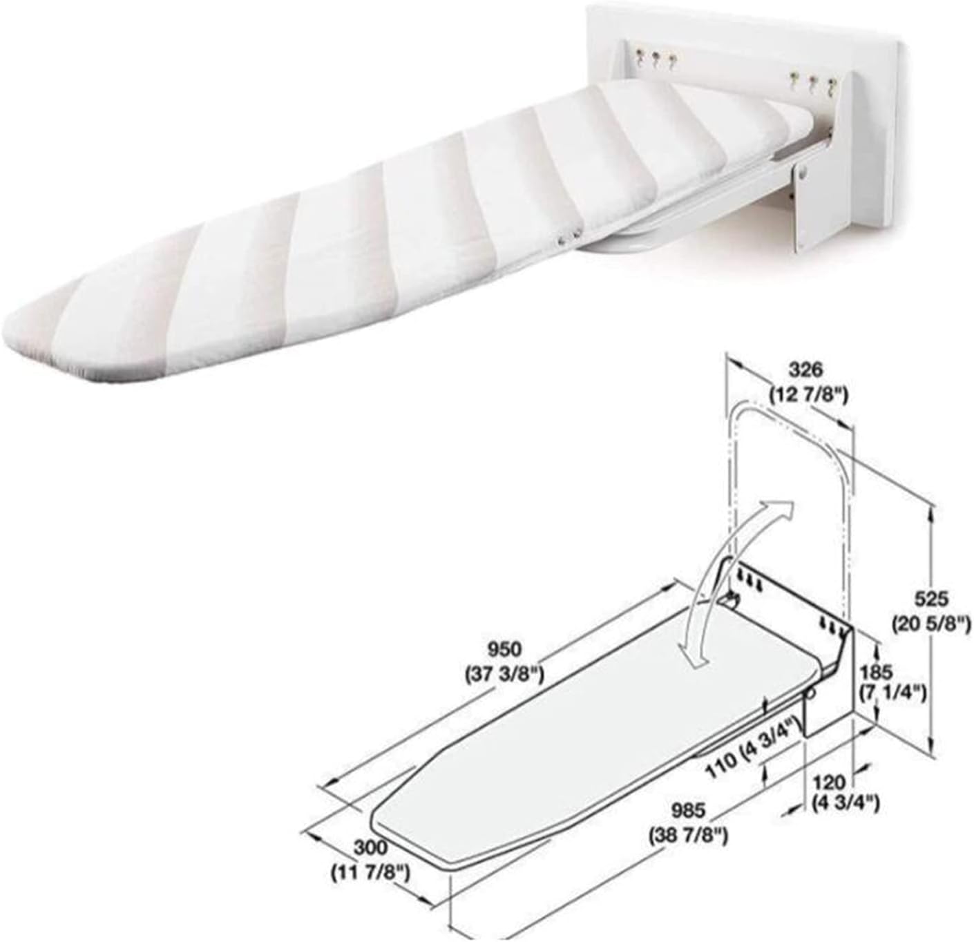 High quality, beautiful and valuable ,an adult can easily unfold and fold the ironing board wall-mounted ironing board Advantage:- It's so easy to use and nice to always have available rather than taking up space with a traditional stand up board- Takes up little space. Since it swivels 180 degrees-Perfect Sizewall ironing board measures 37.4" Lx12.8" W ,when its openand folds up against wall to 12.8" Wx20.7" Hx4.7" D.IMPORTANT: This wall mounted ironing board must be mounted into studs/reinforced wall and should not be mounted directly into dry wall .Includes Wood Mounting Plate to Mount onto wall for easy Installation