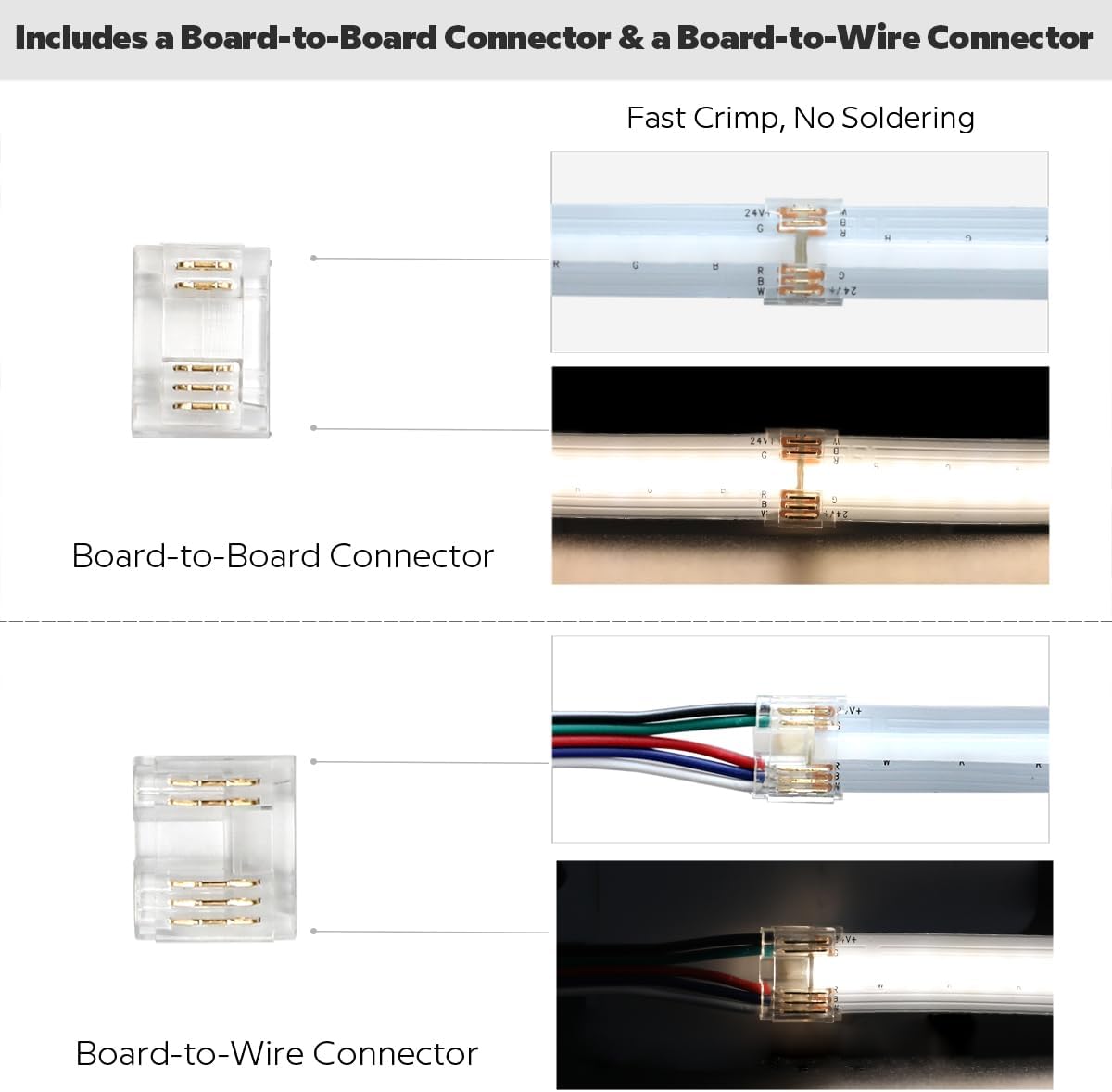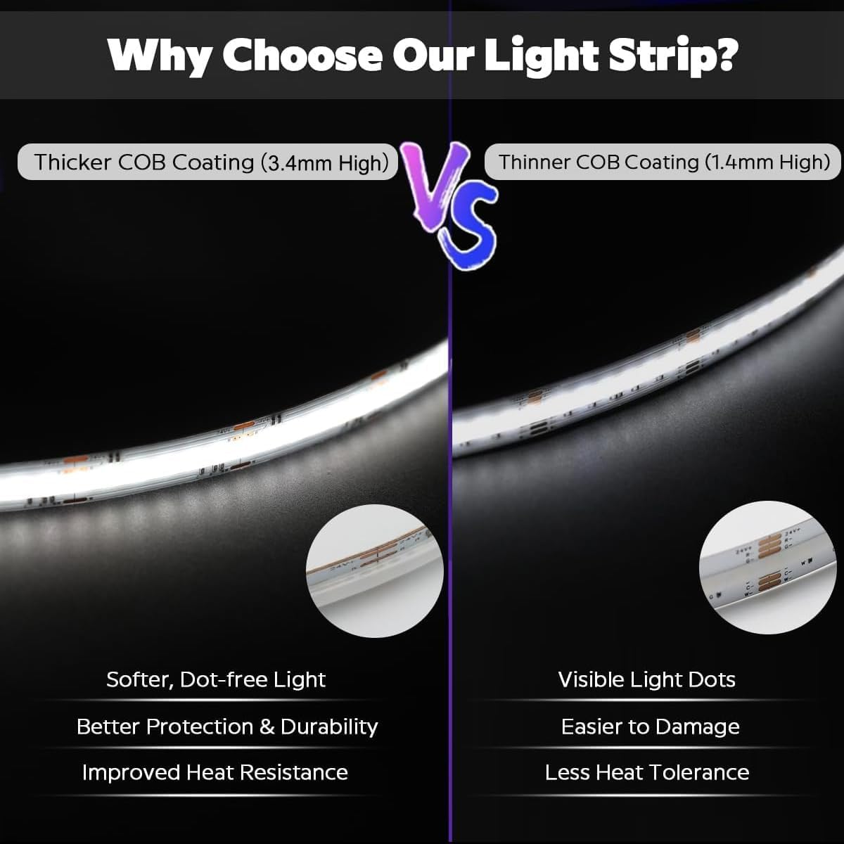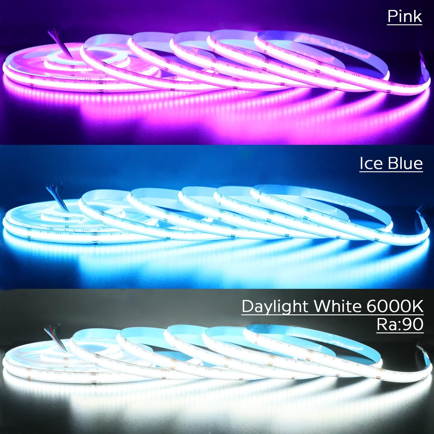 Product Description: This multi color flexible COB RGBW color changing LED strip lights comes with a 3M adhesive backing, tear off the adhesive tape to install, easy and convenient. Use with a 24V RGBW controller via APP or Voice Control methods, and need an 86.4W 24V LED power supply to run. Note: When using multiple COB LED strip lights, please pay attention to whether the power is sufficient. I recommend using our WiFi Alexa TuYa controller Specifications: LED Strip Type: COB LED Strip LED Chip: COB Input Voltage: DC24V Current: 3A/roll Power: 14.4W/M, 72watt/roll PCB Width: 12mm/0.47in LED Quantity: 784Chips/m, 3920Chips/roll Lumen: 10001200LM/m LED Color: RGB+White Color Temperature: Daylight White 6000K Cut Length: 71.4mm/2.8in PCB Color: White Color Rendering Index(CRI): Ra>90 Beam Angle: 180° Length: 5m/16.4ft Waterproof Rating: IP20 nonwaterproof Lifespan: 50,000+hours Working Temperature: 20℃ +45℃ Storage Temperature: 20℃ +60℃ Applications: Mood Lighting Ambient Lighting Entertainment Lighting Indoor Lighting Home Lighting Ceiling Lighting Bedroom Lighting