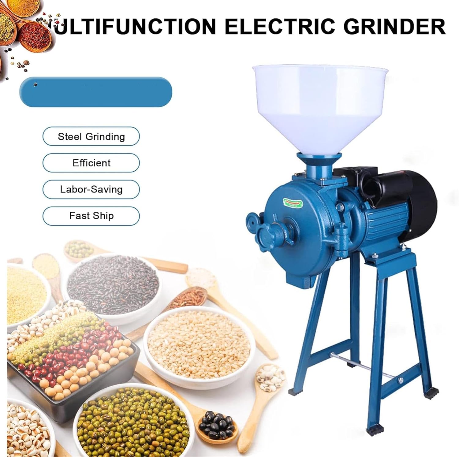 Introducing our premium electric grain grinder, expertly crafted from durable galvanized iron to ensure longevity and resistance to rust. This grinder harmoniously combines traditional milling techniques with modern steel mill technology, delivering an outstanding grinding performance that enhances your culinary endeavors.With its sleek, compact design, this versatile grinder offers a user-friendly experience. The quick-opening mechanism and snap-on cover make it simple to operate, while the mirror-polished machine cover, secure snap-down lock, and sealing rubber ring enhance its durability. The non-slip mat base ensures stability during use, allowing you to grind with confidence. For optimal maintenance, avoid direct water exposure to the tank to protect the motor.Equipped with overload protection, this electric grain grinder guarantees efficient mixing and consistent results, prioritizing your safety during operation. The rubber feet provide a stable foundation, ensuring both your safety and the longevity of the machine.Ideal for a variety of food applications, this grinder excels at transforming bean curd, starch, rice flour, and corn into fine powders. It efficiently grinds wheat, rice, corn, sorghum, soybeans, and other grains into dry powder, making it an essential tool for home cooks and food industry professionals alike. Enhance your food preparation with this reliable electric grain grinder, designed to meet your diverse grinding needs.