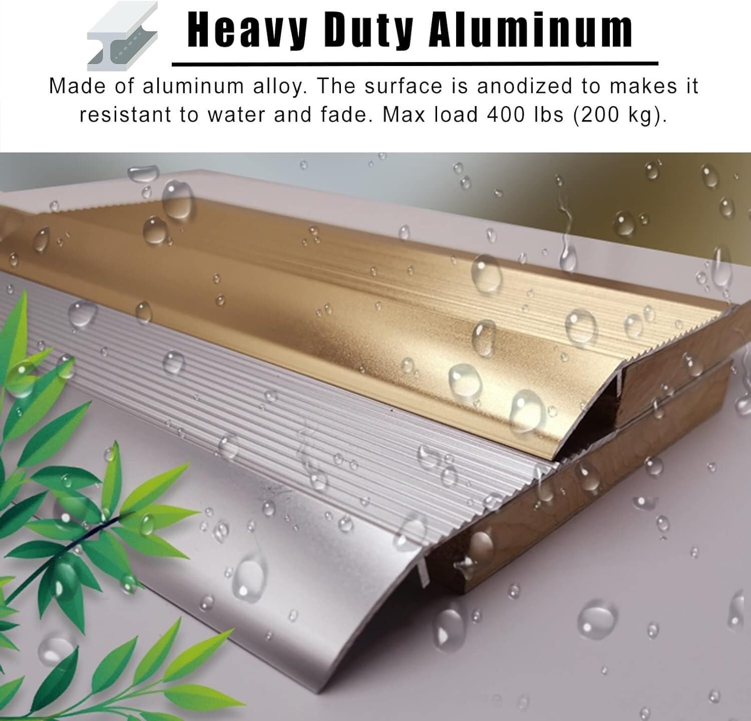 Aluminum floor transition strips to cover seams or gaps between two flooring surfaces and protect the edge of the floor for doorways, room entrances or other locations. Helpful to protect children or the elderly, and not easy to trip, make your home beautiful and safe.◆ Specifications:- Material: aluminum alloy Aluminum alloy- Width: 10 cm (4 inches) - Length: 90 cm (35 3/8 inches)- Applicable Pitch: 0.8cm-4cm (1/4"-1 5/8")- Colors: Gold, Silver, Black- Cuttable.◆ Packing List:- 1 x 90 cm Floor Transition Strip ◆ Features - Aluminum floor transition strip- No nails/screws required- Easy to clean, not easy to trip◆ Attention:- Due to manual measurement, there may be an error of 1-3 cm.- Color difference may exist due to the difference between the recording light and the display. Please refer to the actual product.◆ Quality Service:- Please feel free to contact us when you encounter any problems while using our products, we will try our best to solve them for you. If you leave a message in the comment or feedback and we can't find and solve it in time, you can tell us through message. Thanks!