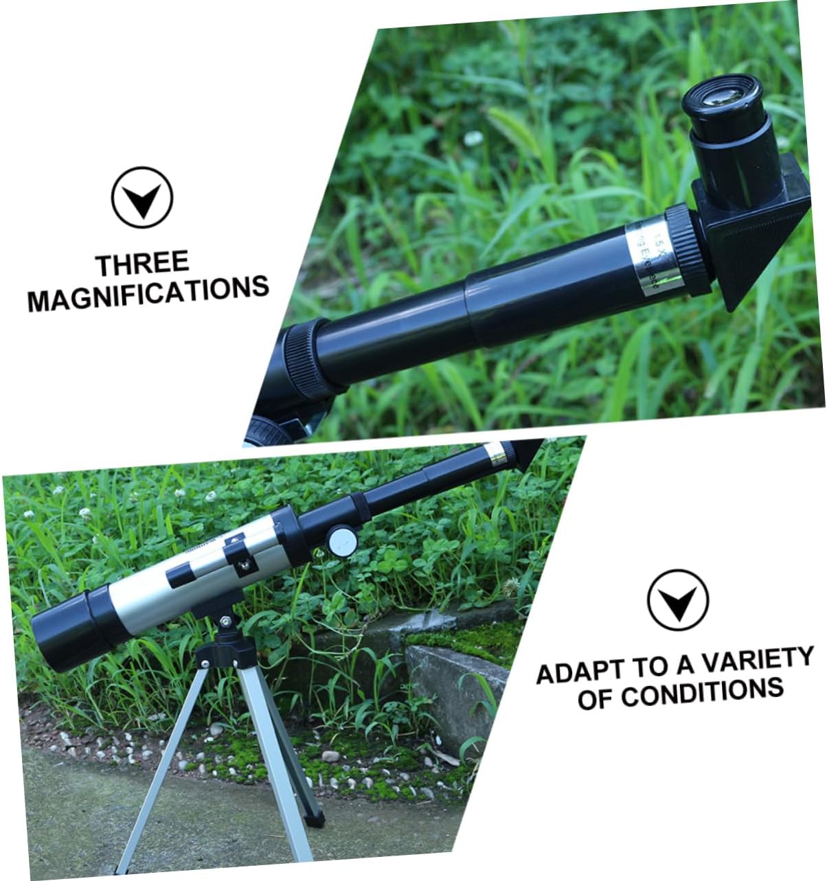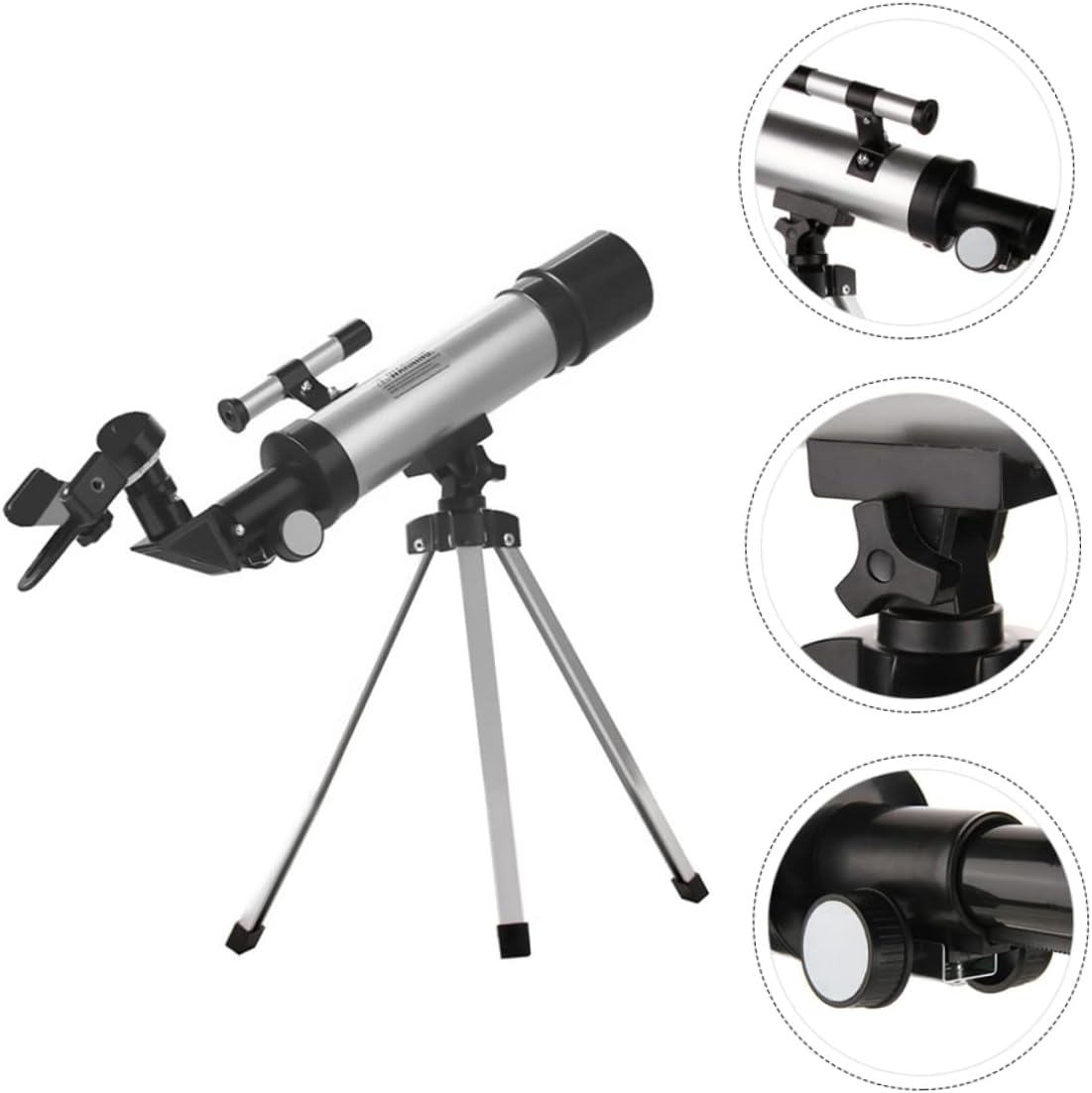 Package List 1 x telescope 1x 1 x H20mm eyepiece 1 x H6mm eyepiece 1 x 1.5X upright eyepiece 1x Tripod Features - Color: Silver refractor telescope. - Refraction type/focal length: 360mm, clear aperture: 50mm telescope handheld stargazing - Standard 0.965 inch accessories include: telescope - Size: About 45x34x34cm/ 17.68x13.36x13.36 inch beginner telescope. - Eyepiece: H6mm, H20mm, 1.5 times extender telescope for adults astronomy - Tripod height: 34cm - Theoretical resolution: 2.800 arcseconds, which is equivalent to seeing two objects 1.357 cm apart meters. - Large magnification of this section: 90 times (objective lens focal length/eyepiece focal length * several times Barov’s multiple = large magnification) - Clear aperture: 50mm (2.4″) - Material: ABS, acrylic, glass, aluminum alloy. - Oblique mirror: 90° - Visual penetration through : 10.49 - Focal length: 360mm.f/7 - or beginners can install it themselves without any tools telescope for adults. - One smartphone adapter to capture and record every beautiful moment, and share with your friends telescope. - Jingwei table and aluminum tripod SpecificationGoods Descriptiontelescope for adults astronomy This is a compact and versatile telescope with a distinct sight and a high magnification power.telescope Suitable for and teenagers. telescope It is suitable for astronomical observations and land use as a powerful range, with optical glass objective and full multi-coating, so even in low lighting conditions also has a very