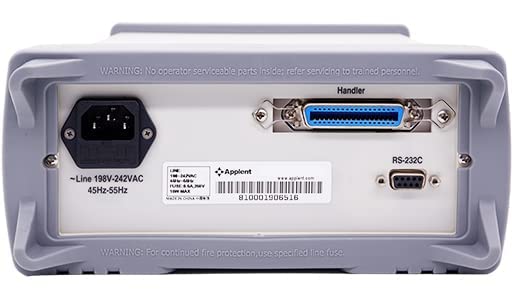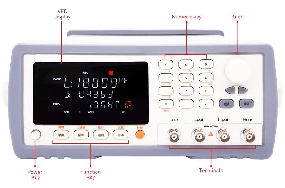 YFYIQI High Precision LCR Meter Digital LCR Meter Inductance Resistance Capacitance Measurement with Measuring Frequency 100Hz 120Hz 1kHz 10kHz Source Resistance 30Ω/100Ω Parameter Z D Q θ ΔABS Δ% Features: VFD Display Correction: OPEN and SHORT View: ΔABS, Δ% or Sorting Result on 3rd Line Comparator Function: 20 files, P1,P2,P3,NG,AUX, HI, IN, LO Interface: RS232C and Handler Key lock function Data Hold function Specification: Test Functions:L,C.R,Z,D,Q Accuracy:0.1% Measurement Frequency:100Hz, 120Hz, 1kHz, 10kHz Measurement Range:AUTO/HOLD, 6 Ranges Measurement Speed:15 times/s, 5 times/s, 3 times/s Display Range: L: 0.01μH-9999H C: 0.01pF – 9999μF R,X,Z: 0.0001Ω - 99.99MΩ D, 0.0001 – 9.9999 Q: 0.0001 – 9999.9 Source Resistance:30Ω and 100Ω Monitor Parameter:Z, D, Q, θ, ΔABS, Δ% Display Reader:5 digits: 99999 Equivalent Circuit:Serial and Parallel Signal Level:10.00mV~2.00V AC; 100.0μA~20.00mA AC Trigger Mode:INT/HOLD/MAN/BUS Comparator:P1/P2/P3/AUX/NG Comparator Mode:SEQ/ABS/PER Adjustment:OPEN/SHORT Zeroing Beep Feature:OFF/P1/P2/P3/AUX/OUT Interface:RS232/Handler Protocol:SCPI Power Supply:AC 198V-240V, 50Hz-60Hz;15W MAX
