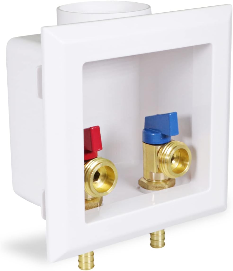 The Highcraft Washer Box is built with durable, leak-free ABS plastic for reliable performance. It features a sleek, compact design, and it’s compatible with washing machines, ice makers, gas valves, and air admittance valves. This kit includes an outlet box with faceplate, 2 quarter-turn brass valves, nuts, mounting brackets, and an interlocking center clip. It features 4 mounting tabs for stud mounting and optional clip-on brackets for added versatility. With top and bottom center drain knockouts, it can be installed upside down for top-mount valves or as a center drain box. The box conforms to UPC and ASSE standards, with lead-free brass valves certified to NSF61-372 and ANSI A112.18.1 for water distribution. 3" box depth, adjustable faceplate for up to 1" wall thickness, and compatible with 1/2" pipes.
