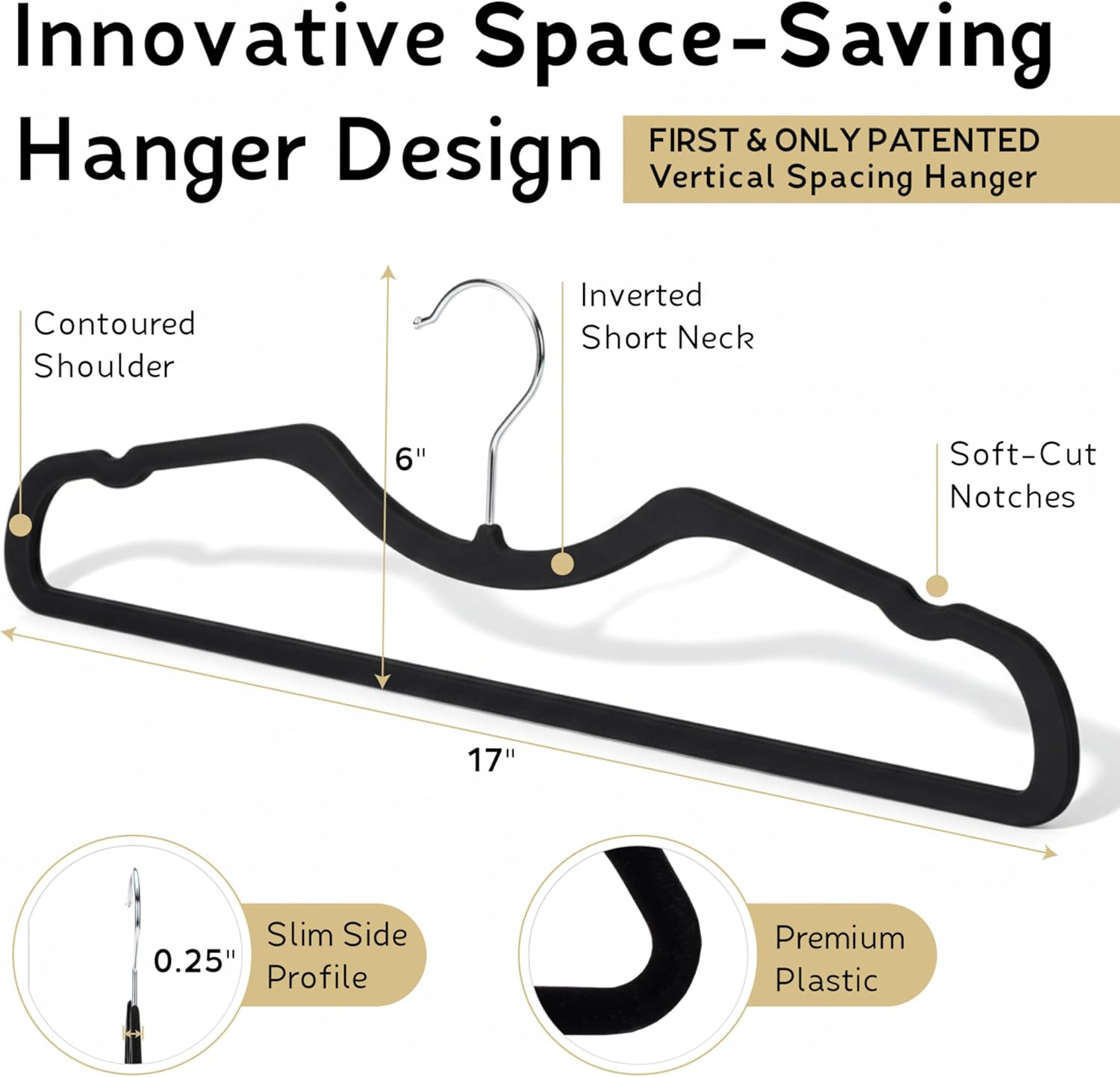 Stop wasting vertical space in your closet! With Higher Hangers' black plastic hangers, you can save space and organize your closet in a more efficient way by hanging your clothes higher. We understand how frustrating it is to have a messy closet. Higher Hangers help tidy up your closet area. Our slim hangers conveniently reduce wrinkles and clutter by keeping clothes off the floor, making the space cleaner and more functional. 1/4" (6mm) slim design saves lateral space for more hangers to fit on your rod. In an average closet, our space-saving hangers free up the equivalent space of 7 carry-on pieces of luggage or 48 pairs of shoes. High Hangers' premium plastic hangers are elegant and useful, designed to keep your clothes properly hung. Perfect for clothes that are hard to hang, like dresses, pants, and skirts, as well as for garments made of silk or satin, and those with straps or wide necks. They're just what you need for your closet to give you joy as it's supposed to!