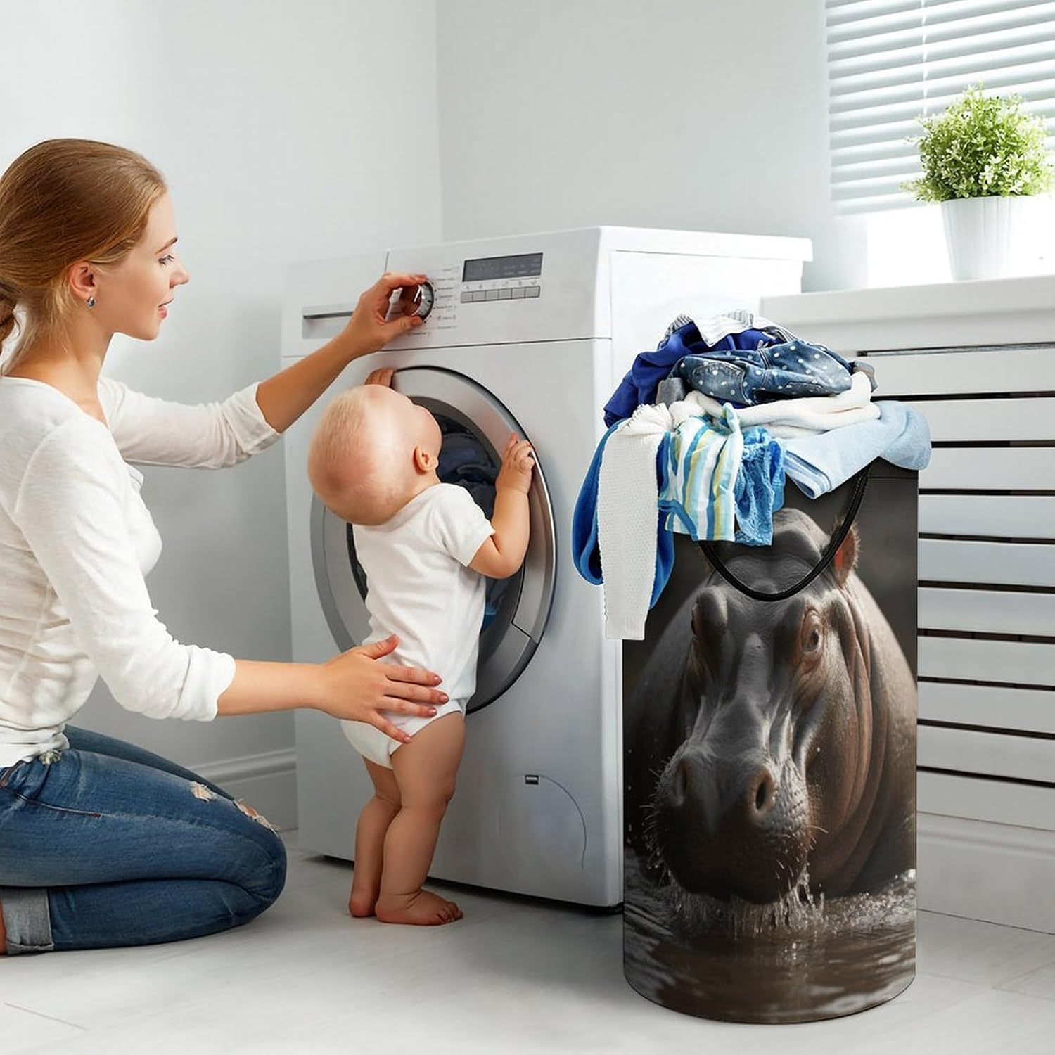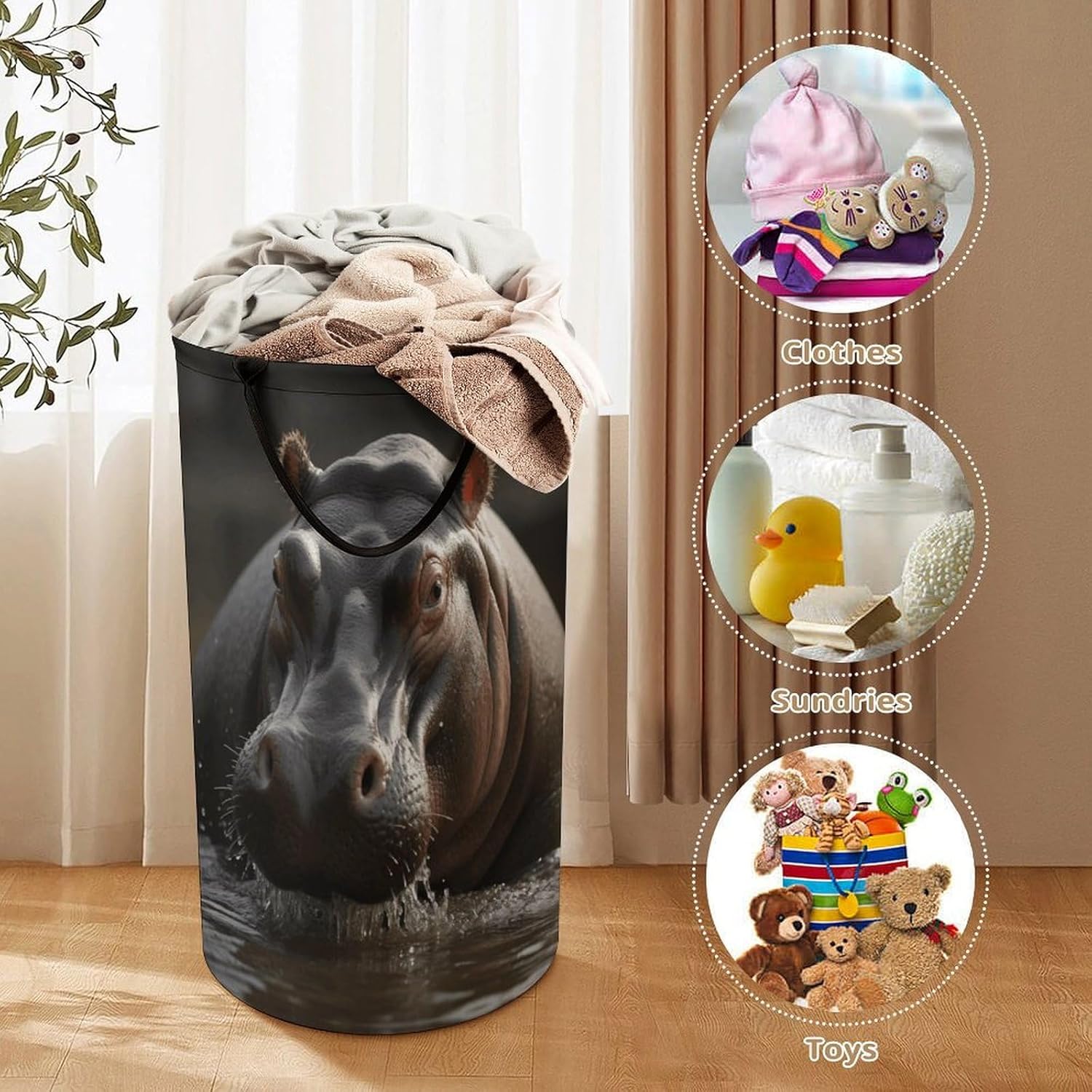 The pattern of the Hippo hamper is printed with exquisite patterns, which makes the product more attractive.Chic design allows it to be used in the living room to hold throw blanket, pillows, and reading materials, as well as in the bathroom for towels, or as a laundry hamper.The laundry hamper adopted collapsible design, equipped with handles. It is lightweight and portable for using, storing, and moving conveniently.Hippo Clothes hamper is suitable to store dirty clothes washing, place in the room to store toys, and other household goods, keep the house clean and tidy. Perfect laundry hamper for home, office, closet organizer, bedroom, bathroom, college dorm, etc.Gets out of your way when you need it to. This storage basket or laundry hamper is a good gift, which not only meets everyday storage needs but also carries deep care and love, a perfect way to turn thoughtfulness into warmth.