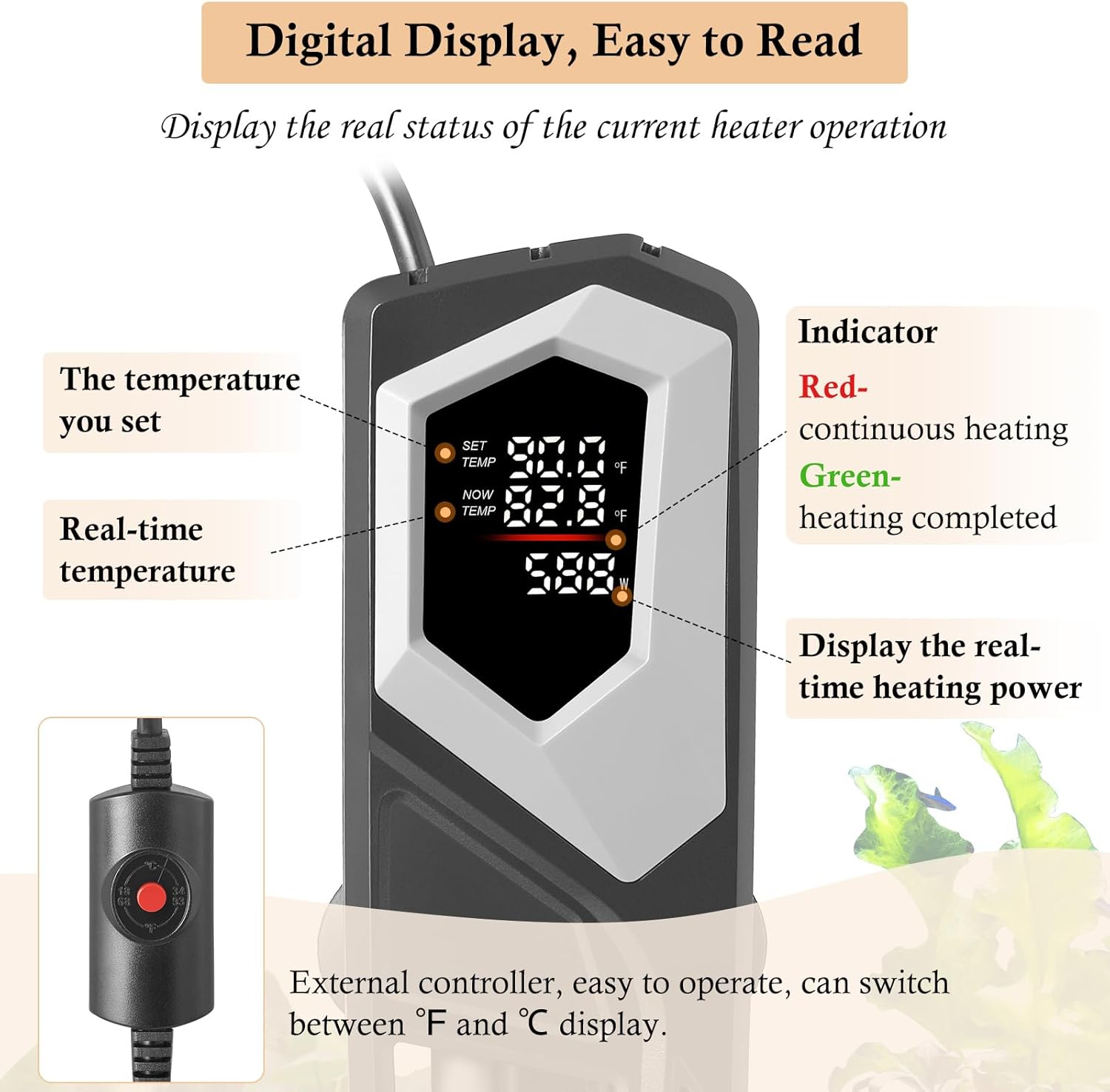 • [Digital LED Display & External Controller]: This fish tank heater with digital LED display can display the set and real-time water temperature. You can also observe the current heating power on the display. Adjust the temperature easily with an external controller without removing the heater from the tank. The temperature setting range is 64.0°F~93.0°F (18.0°C~34.0°C).