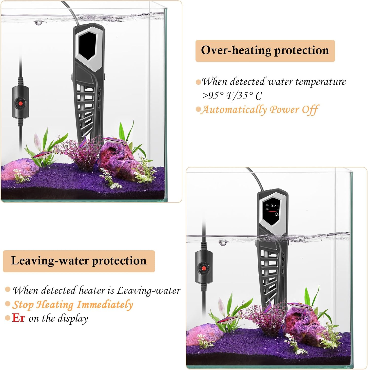 • [Over-Heating Protection & Leaving Water Protection]: This aquarium submersible heater will automatically cut off the power and stop heating to avoid any damage to your lovely pets when the water temperature exceeds 95°F or the heater is partially above water.