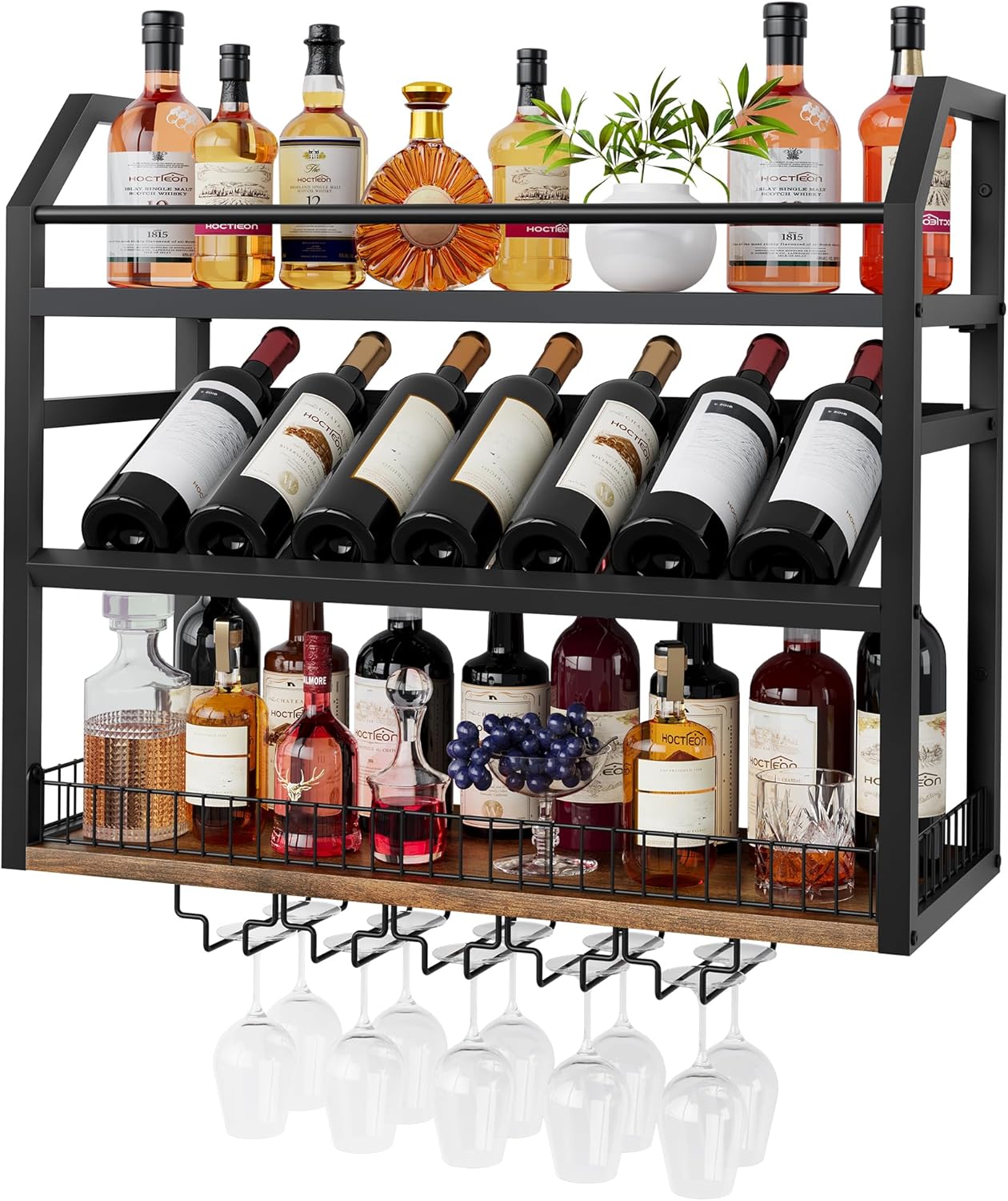 Hoctieon Wall Mounted Wine Rack, Large Capacity Bar Shelve, 3 Tier Hanging Wine Racks with Glass Holder, Rustic Brown