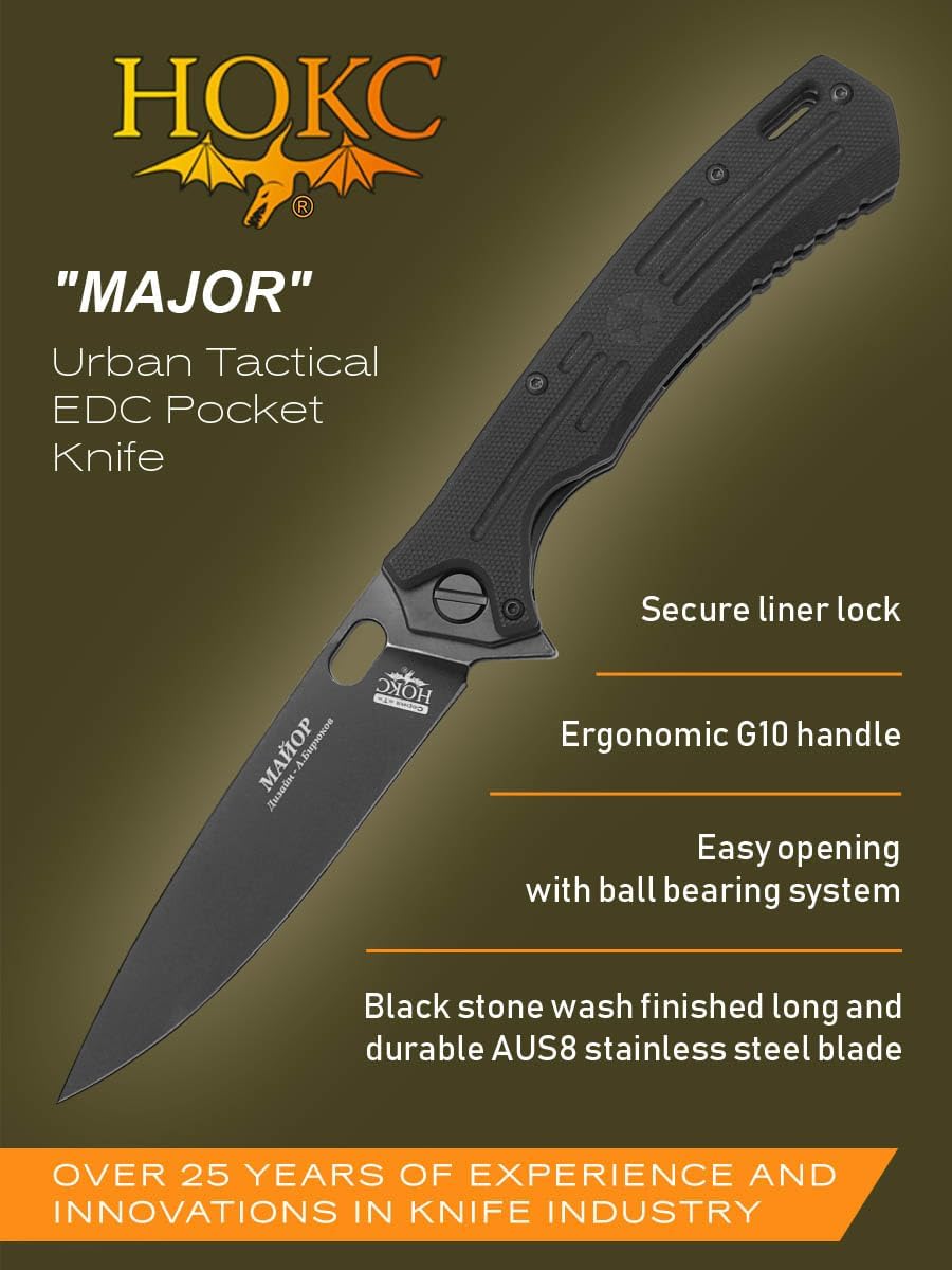 HOKC (NOKS) MAYOR (MAJOR) URBAN EDC POCKET KNIVES A folding knife designed for professional users, Major features opening system with ball bearing and finger flipper for fast and easy opening. Major is easy to carry, with a highly functional 4.21"" black stone wash finished long and durable AUS8 stainless steel blade. Its powerful Liner Lock mechanism also features built-in blade locking safety. Designed by Russian master Aleksander Biryukov. ABOUT HOKC The company has been in existence since 1998. We specialize in the development and manufacture of edged weapons and special equipment. Some samples have been officially adopted by elite units of the Russian army and special forces. This weapon has proven itself well in combat operations. Using the experience gained in the military field, HOKC produces a range of knives for civilian use, as well as equipment for hunters and travelers. At the same time, the most modern materials and technologies developed for the military industry are used. HOKC products have their own design style, which is very different from the style of other companies and not afraid to explore new areas. Our developments and our products have been tested in the harshest conditions. And we can proudly say that we have over 25 years of experience and innovations in knife industry.