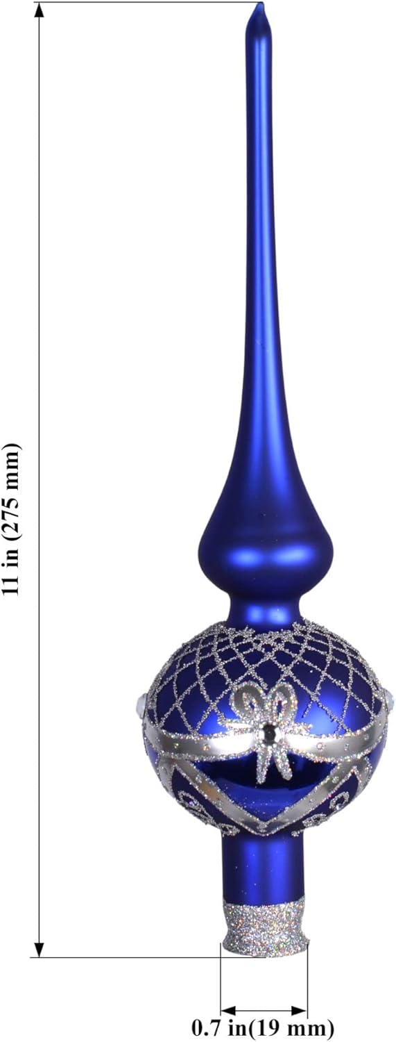 "Crystal" blue Christmas tree finial stands 10.5" (270 mm) high to adorn the top of your tree in a beautiful blue finish. It is highlighted by iridescent colored glitter resembling a leafy pattern design wrapped around the ball portion of the finial. The spire above sparkles with the same frosty glitter with the addition of four long sparkling leaves curling below. Small white dots were carefully placed to give the appearance of falling snow. Surely a tree topper to enhance the beauty of your Christmas tree or simply to display on a finial stand in your home as an accent piece. Each glass finial is painted individually which makes them unique and adds some small variations to each product in height and bottom opening.