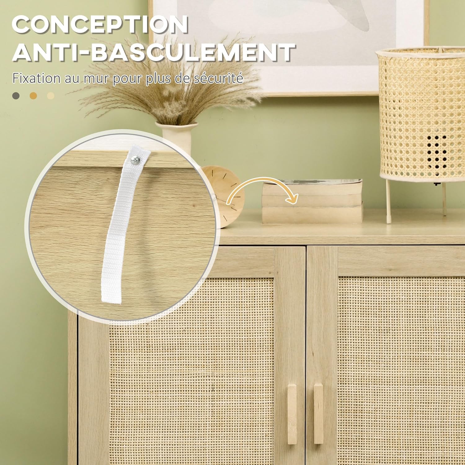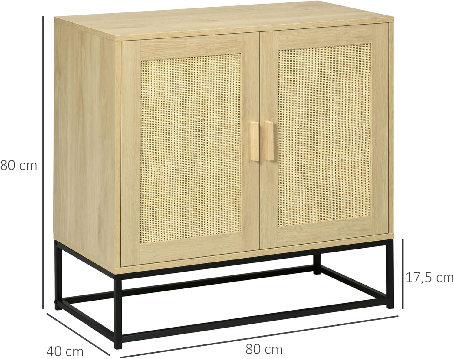 Description: With a bohemian and functional design, this sideboard brings an authentic touch of great effect to your room. The cane-effect rattan front hides a clever space for storing your belongings. You can also use it in a bedroom to store laundry or in your child's room to store their toys. Features: ● A bohemian style furniture combining originality and elegance, ideal for adding an authentic touch to your home ● Nice mix of materials: wood look and rattan weave to enhance your home ● Graceful finish: cane effect rattan weave cabinet door fronts and black metal legs ● Multi-space: 1 large double door wardrobe with 1 inner shelf provides plenty of space for storing laundry, tableware or other items ● Adjustable shelf to 3 different heights according to your needs ● Quality materials, durable use: sturdy steel base, high class E1 particle board structure (recommended maximum total load 35kg) ● Rear tipping device: maximum safety of use Quick and easy assembly thanks to the illustrated assembly instructions included Specifications: ● Colour: Natural ● Material: Particle board, natural rattan, steel ● Overall dimensions: 80L x 40W x 80H cm Internal cupboard storage dimensions: 77 x 38 x 58 cm (L x W x H). ● Feet height: 17.5 cm ● Max. : 35 kg (total), 20 kg (cupboard), 15 kg (tray) ● Ref. : 838-369V81ND ● Possibility of taking back your old product according to our GTC. Package includes: 1 x Low Sideboard; 1 x Assembly Instructions