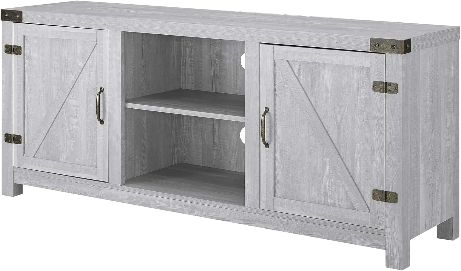Include our TV stand in your living room to give the area a charming, country feel. Features concealed storage space behind the barn styled side doors with adjustable shelving to fit your media and accessories, while having a mix of rustic and modern farmhouse style. This entertainment center is made of durable, warp-resistant MDF and can support most TVs up to 65-inches. As a storage console, it will keep your living room looking neat while also giving it a homespun feel.