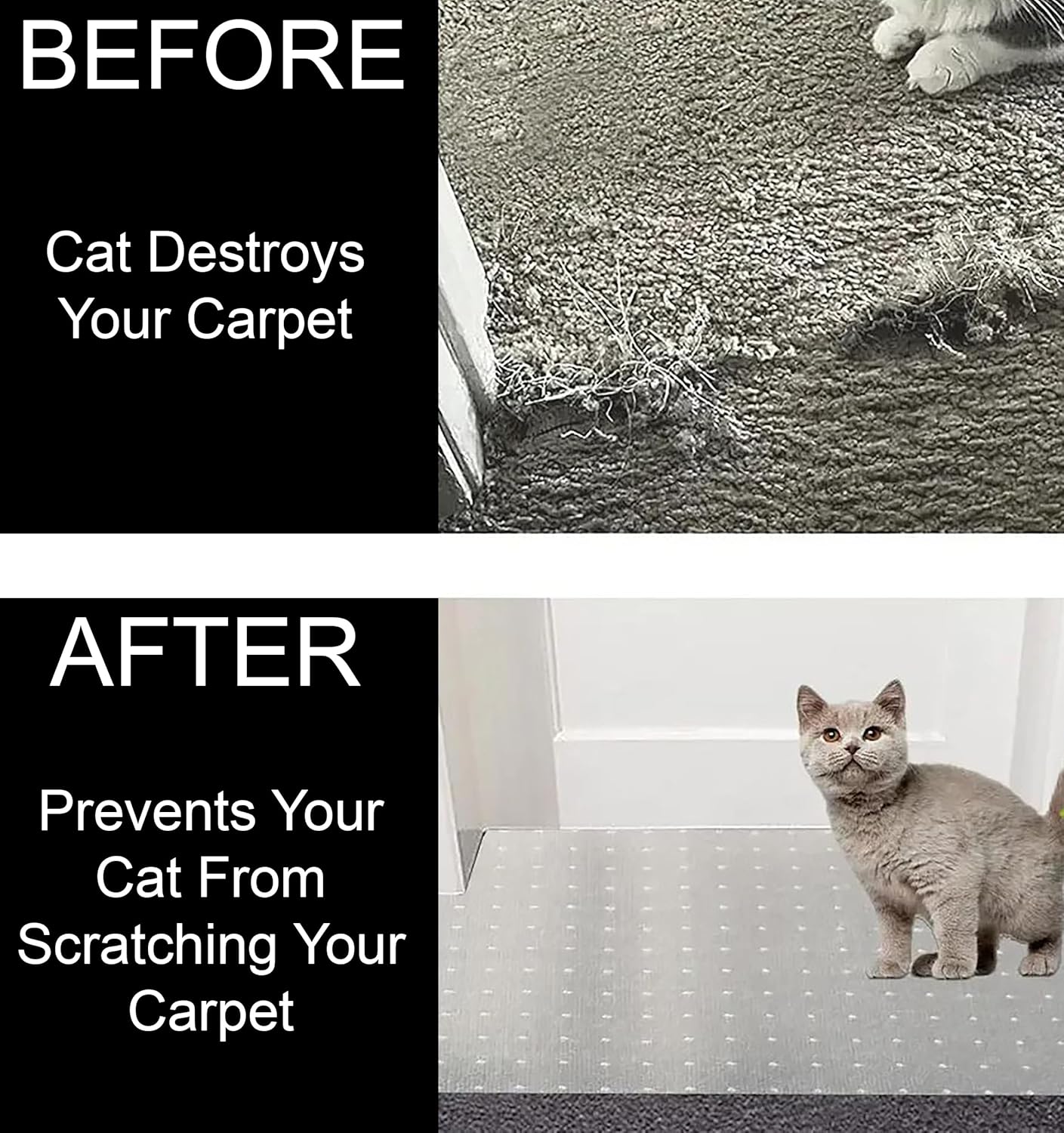 Tired of seeing your carpets ripped up by your pets? Do your cat claws get stuck in your torn carpet and get hurt? Don't worry, we have the perfect product. Look no more, we have our CARPET PROTECTOR which will work with any carpet. No more scolding your kitten by using our vynil Anti-scratch carpet under your doors, you will protect your carpet and your Kitten. Our Plastic Mat is a clear product, easy to cut, durable, non-slip, and comes in a roll so you can cut to the size of your doors.