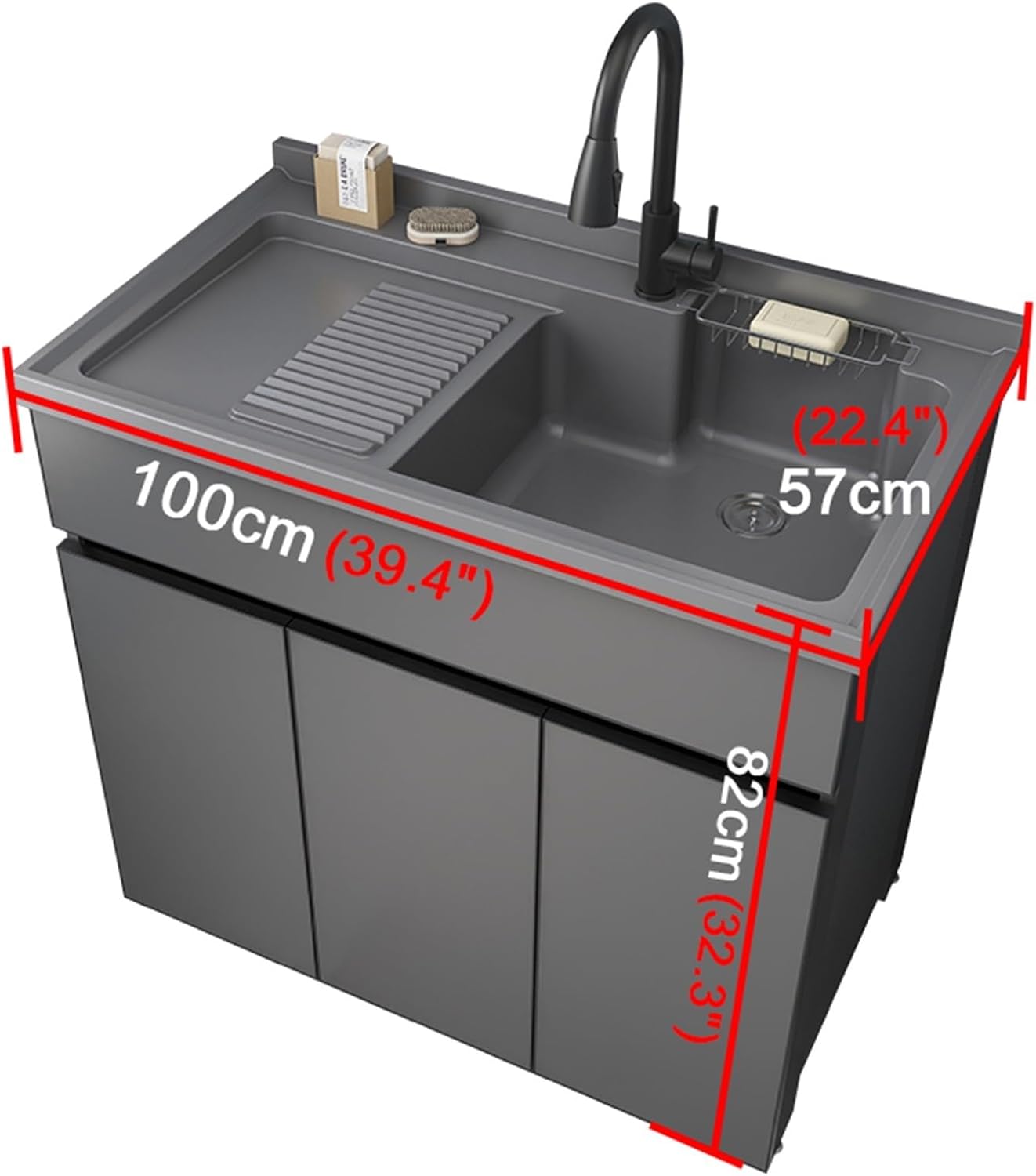 Name: SinkMaterial: Stainless steel and aluminumColor: GrayContents include: Sink x1 (excludes other items shown in image)Dimensions:90x57x82cm (35.4x22.4x32.3")100x57x82cm (39.4x22.4x32.3")Features:1. Ample storage space for versatile organization. Reinforced aerospace-grade aluminum balcony cabinet with honeycomb panel construction ensures enhanced durability and resistance to deformation.2. Dual-drain sink design for effortless cleaning. Oversized, deep basin prevents tangling during laundry. Raised splash guard keeps countertops cleaner with enhanced waterproofing.3. Integrated washboard with angled design for effortless laundry. Concealed deep-groove handles external protrusions, prevents household bumps.4. Adjustable cabinet feet compensate for uneven surfaces. Silent-close hinges with stainless steel chains withstand repeated testing while maintaining structural integrity.Applications: Suitable for kitchens, balconies, bathrooms. Main cabinet balcony aluminum construction withstands wind and sun exposure.Important Notice:1. All dimensions are manually measured and may have slight variations. Colors may appear slightly different due to shooting angles or lighting conditions.2. This stainless steel product may have weld points and minor surfaces scratches, which do not affect functionality.