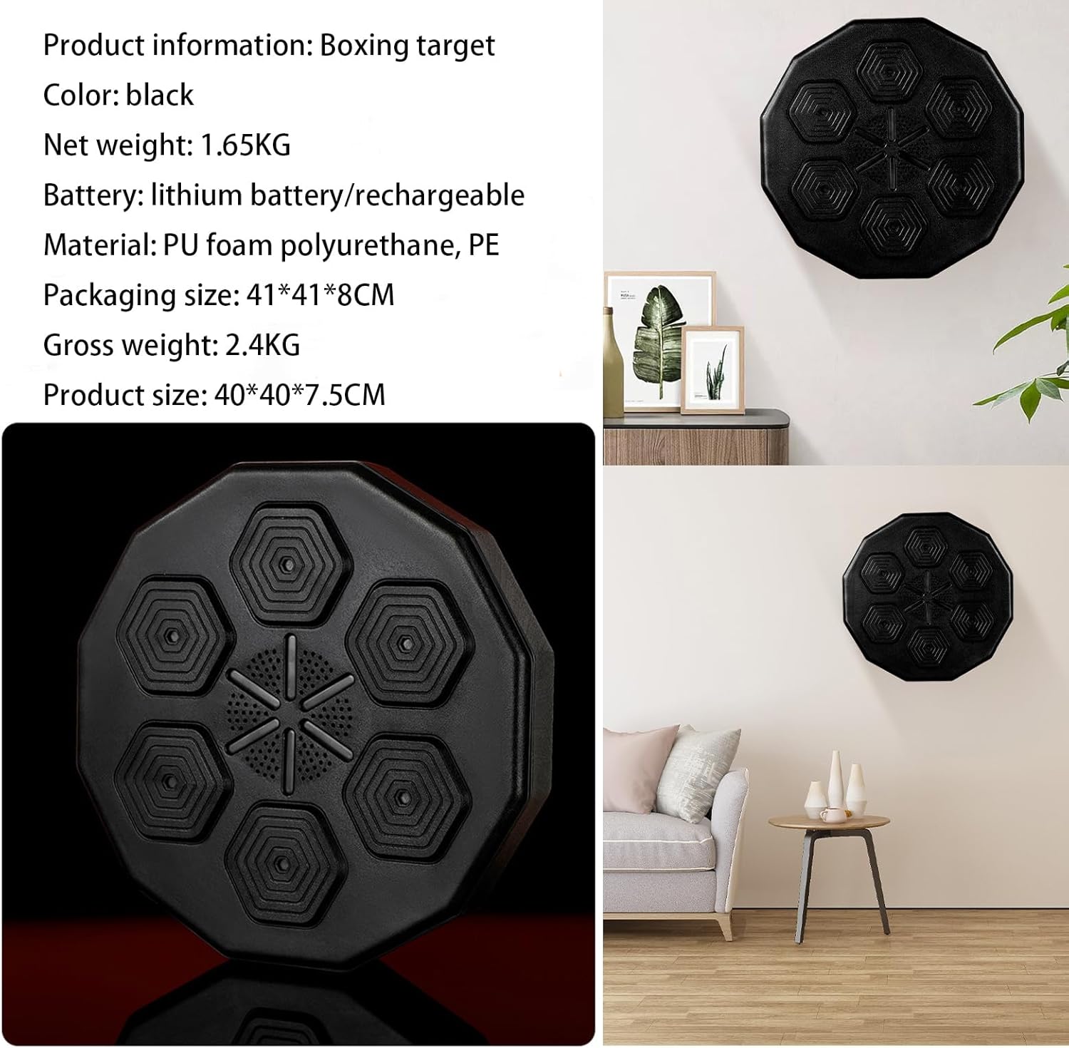 Product Description:One purchase, multiple experiences. Whether it is daily exercise or family entertainment, the music boxing machine is an excellent choice. Create a healthy life for you.Product Specification:material:PU foam polyurethane, PEColor: blackProduct Dimensions:Product size:40*40*7.5CMWeight : 2.4kgPacking list:1*Music Boxing MachineNotices:1.The packaging of the product package may be updated at any time, please refer to the actual product received.2.All colors on our website are for reference only, actual product colors may vary a little bit, due to different colour settings of every screen device.3.Most of our Music Boxing Machine are hand-measured, therefore the dimensions are for reference only, and may marginally deviate.