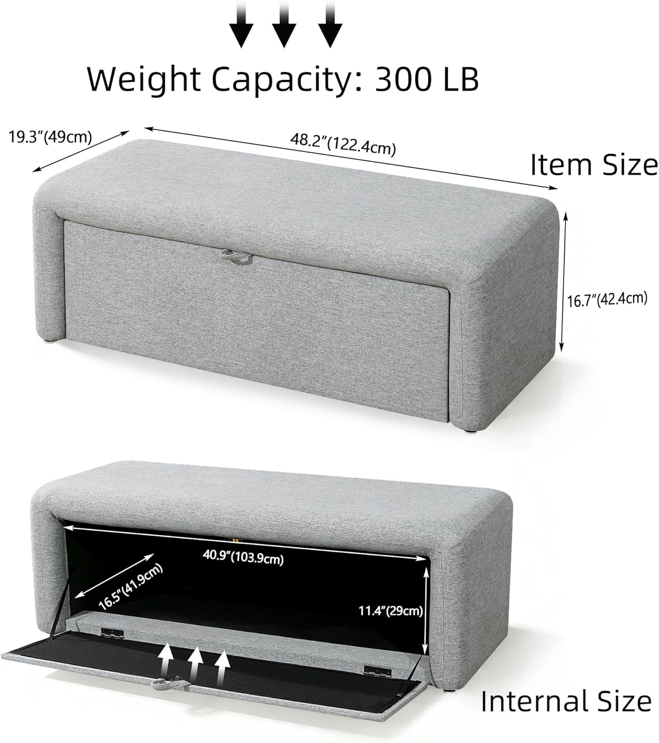 Are you looking for a stylish yet functional solution to declutter your home? This storage ottoman is engineered to provide both comfort and utility. Measuring 48"L x 19"W x 16.7"H, it fits seamlessly at the foot of a queen-sized bed or along an entryway wall.