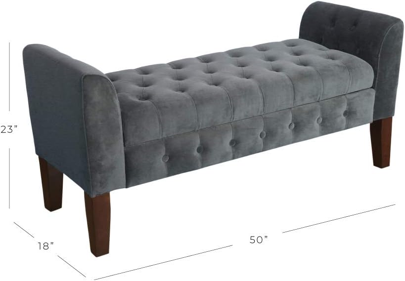 This elegant storage settee features all over button tufting for a luxurious look and feel. Upholstered in a soft and durable premium velvet fabric, this decorative bench has wood legs in a range of rich finishes. The hinged seat opens to reveal storage suitable for spare throws or pillows, books, magazines or toys. Use it as an end of bed bench, as an entryway bench or as extra seating and storage in a living room. This velvet bench is available in 7 rich colors and is part of a broader collection including accent chairs, tufted storage ottomans to match in the same great velvet fabric. Easy to assemble and maintain.Please note that fabric and wood colors may appear slightly different due to variations in lighting or screen settings.