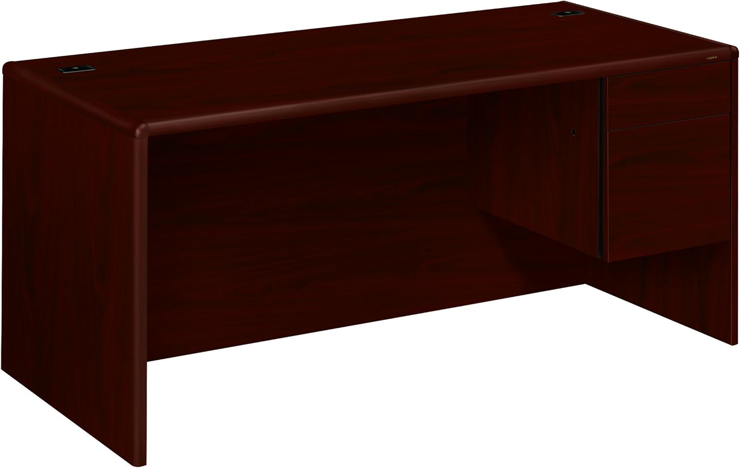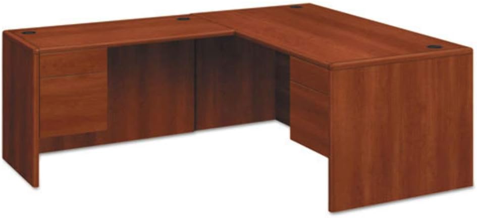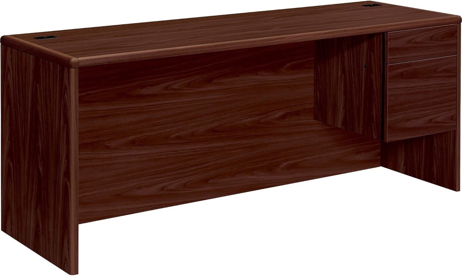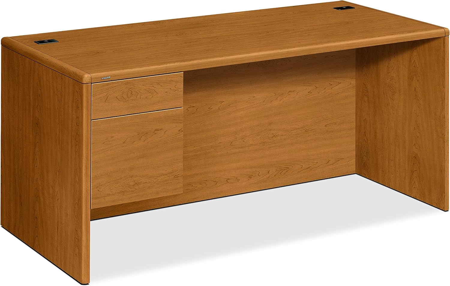 Upscale 10700 Series laminate desks from HON features real wood accents and waterfall-shaped edges. This 48"W compact right pedestal desk was created for offices with limited floor space. Use freestanding, without returns or bridges. Laminate color is Cognac.