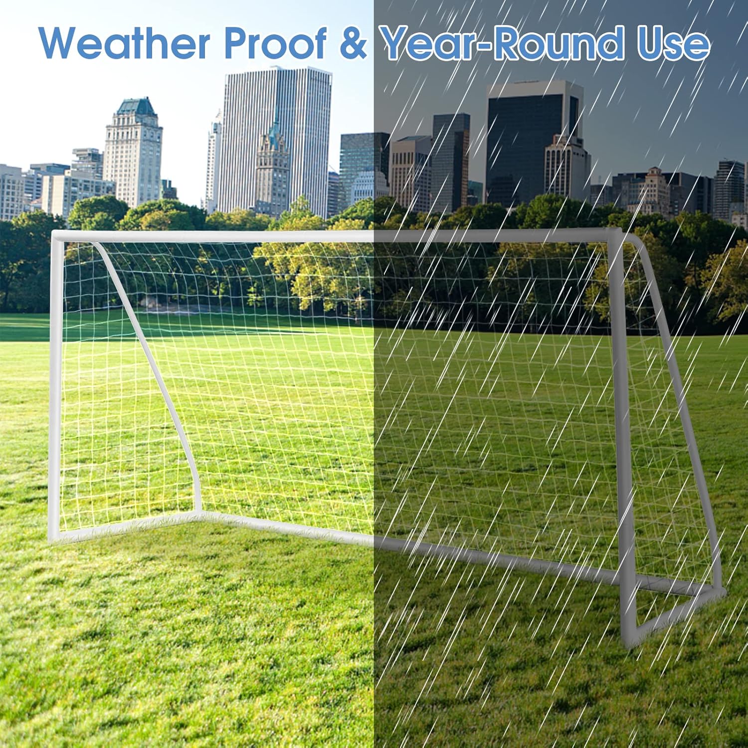 Description: The 12ft x 4ft x 6ft (L x W x H) soccer gaol is a perfect gift for kids and adults. The triangular frame made of PVC ensures better sturdiness and wear resistance to withstand intenser shootings. The weather resistant PE net makes sure that the soccer training equipment is durable enough for the long-time use. More importantly, its assembly requires no tools. Snap-locking design enables you to assemble all tubes together only by hands. Included reusable straps can attach the net tightly to the frame and ground stakes fix the goal to the ground stably. Since its disassembly is simple as well, it’s convenient for you to take it to the playground, park, beach and more occasions. Features: Strong frame made of PVC for better rust resistance and sturdiness Triangular shape evenly distributes pressure for stability PE net firmly fixed on the frame with included reusable straps Weather-resistant PE net durable for the long-term use Thoughtful snap-locking design realizes quick installation Stably installed on the ground with offered ground stakes Perfect for soccer training in the garden, playground, park or beach Convenient to disassemble for simple portability and storage Easy assembly without any tools saves much time and effort Ideal size of 12ft x 4ft x 6ft (L x W x H) for both kids and adults Specifications: Color: White Material: PVC, PE Overall Dimension: 12ft x 4ft x 6ft/365 x 120 x 182cm (L x W x H) Net Weight: 24.5lbs/11kg Package Includes: 1 x Soccer Goal 6 x Ground Stakes 1 x User Guide