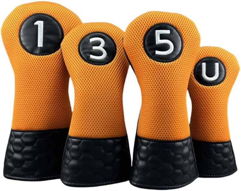 Product Specifications Product Name Honeycomb Two-Tone Orange-Black Head Protector Golf Club Covers Driver/Fairway/UT WeightDriver: 95g/unitFairway 5 Wood: 72g/unitFairway 5 Wood: 72g/unitUT: 54g/unitDimensionsDriver: 17*34cmFairway 3 Wood: 14*30cmFairway 5 Wood: 14*30cmUT: 11.5*24.8cmMaterialPU Leather MaterialWaterproof & Wear-ResistantColorOrangeUsageGolf wood club protective cover