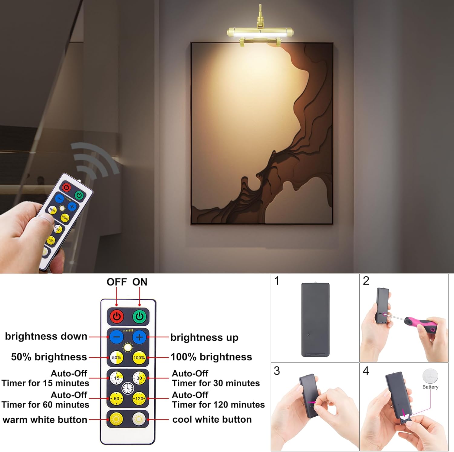 More Details *200 Lumens,28 super bright SMD LEDs, 1.5W, 30,000 hours lifespan. 3 lighting modes: 3000K warm white light, 4300K natural white light and 8000K cool white light.*Material:Plastic shape+Metal goose neck.*The picture light is powered by USB, 5-6 hours full charging time. The led indicator will auto off once the batteries are fully charged.*The remote control will operate lights within 20 feet.Up to 10 lights can be controlled by one remote control.*2 control ways: Remote control and Manual operation using ON/OFF switch.You can also change the brightness level of each color by using ON/OFF switch.InstallationDetachable Clip Mount Bracket (included)1. Attach Detachable Clip Mount Bracket to light by turning the clip bracket clockwise until it is tight. Hand tighten only.2. Open clips, to attach Detachable Clip Mount Bracket to picture frame. For frames 1/2" to 1-1/4" thick.3. Adjust neck and tilt head to desired position.Detachable Screw Mount Bracket (included)1. Remove Detachable Clip Mount Bracket from flexible neck by rotating the Clip Mount Bracket counter-clockwise until loose.2. Place screw end of flexible neck into screw mount bracket. Hand tighten only. Do not over tighten. 3. Place screw mount bracket over top of the frame with the screw holes facing the back of frame.4.Drill a pilot hole for each screw.Insert up to three (3) screws (included) through the holes in the screw mount bracket to secure properly.5. Adjust neck and tilt head to desired position. Replacement remote control battery: Unscrew the screw on the back of remote, and then pull out the battery box to change the remote battery. Packing List- 1 x Picture Light- 1 x Remote Control ( included CR2025 button cell battery)- 1 x Micro-USB Charging Cable- 3 x Screw- 1 x User Manual