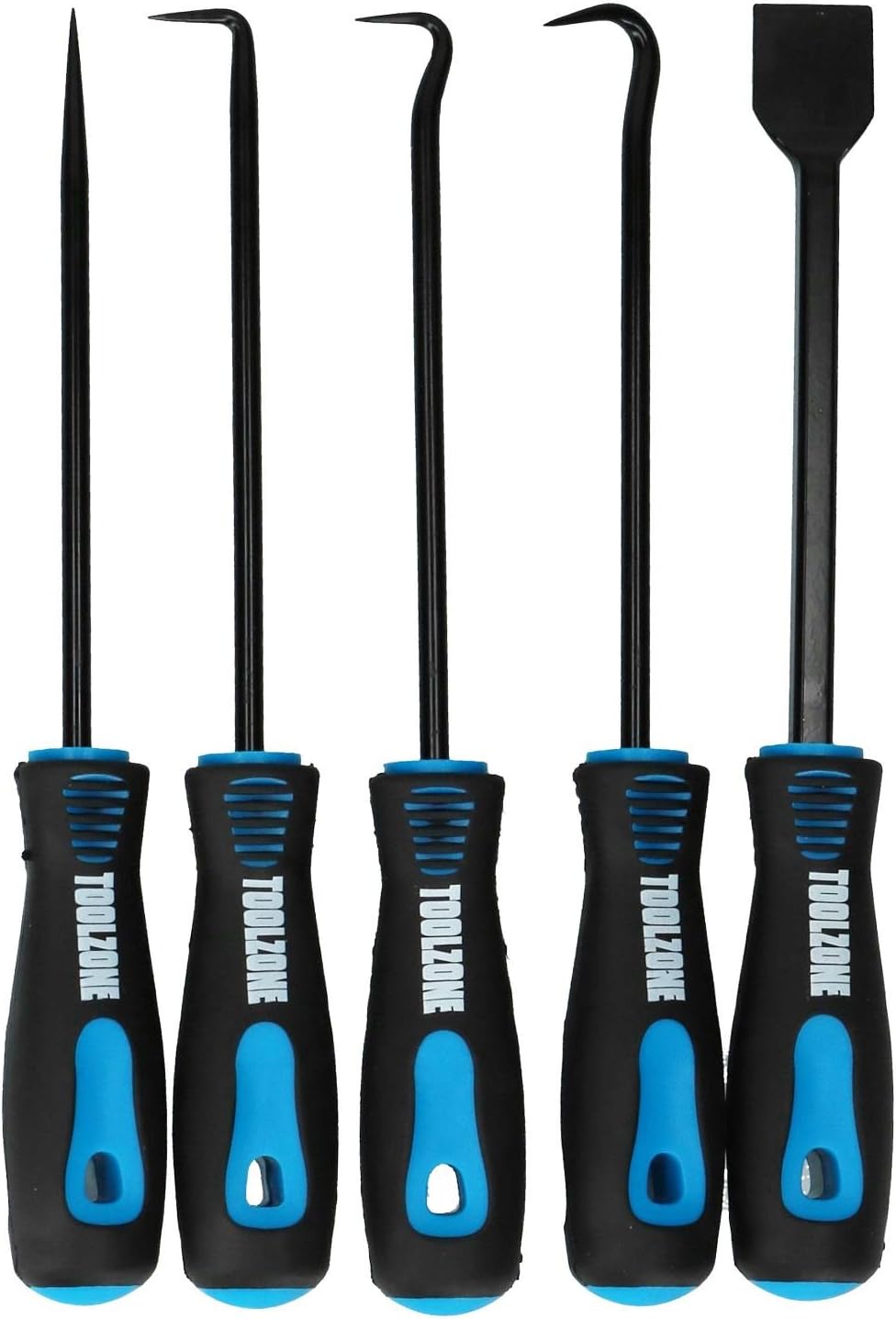 Professional tool for commercial or occasional use Manufactured from chrome vanadium steel for strength and durability Chrome vanadium steel shafts with blackened finish Rubber ergonomic handles for comfort and grip Ideal for gasket scraping and hose removal and many other applications Suitable for a number of applications including the fitting and removal of o rings / seals / bushes / springs / cotter pins / fuses etc The set comes complete in a plastic storage tray which is ideal for placing in your toolbox to keep all of these tools in the same place. SET INCLUDES THE FOLLOWING 1 x gasket scraper - total length 250mm 2 x podger - total length 160mm and 250mm 2 x 90 degree hooks - total length 160mm and 250mm 2 x bent hooks - total length 160mm and 250mm 2 x curved hooks - total length 160mm and 250mm