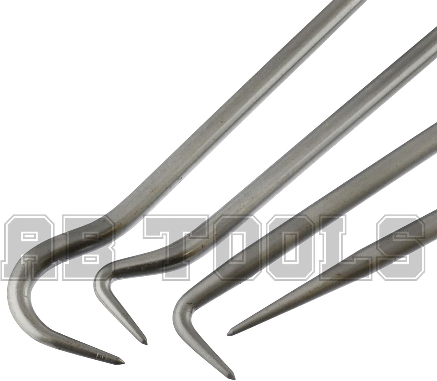 High quality hook and pick set by Bergen. Manufactured from chrome vanadium steel for strength and durability. Ergonomic handles for comfort and grip when using. Hole in the handle for easy storage. Supplied in a plastic tray, ideal for keeping them organised in a tool box/chest drawer. Includes; 1 x straight pick (total length 380mm) 1 x 90 degree pick (total length 380mm) 1 x offset pick (total length 380mm) 1 x hook pick set (total length 380mm)