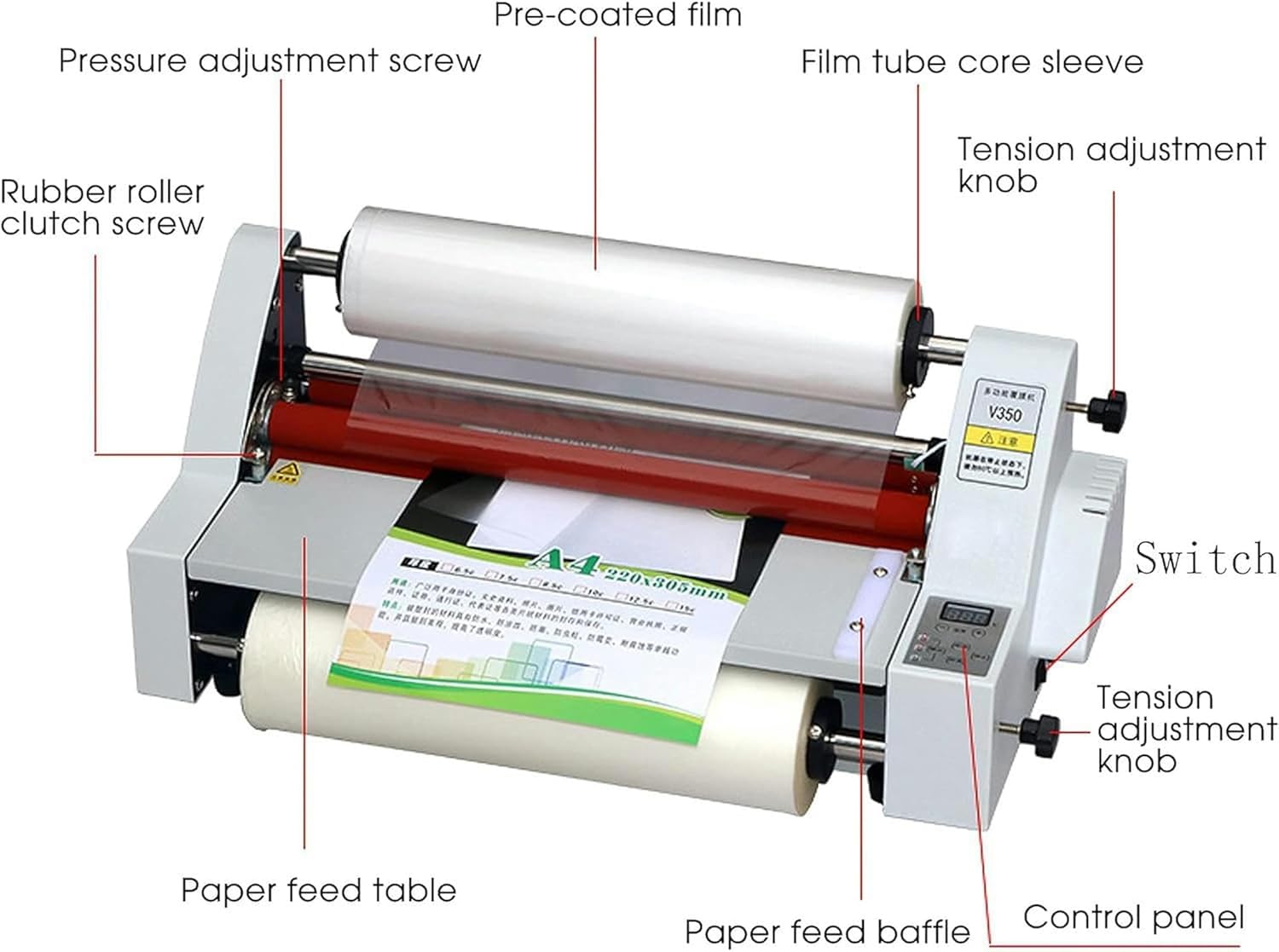 Specification: Laminating width: 350mm Film core specifications: 1 inch Applicable paper: A3 Electric heating power: 0.75KW Motor power: 180KW Laminating speed: About 1.1 m/min Maximum coating temperature: 180℃ Machine weight: 7KG Machine size: 530 * 210 * 220mmPackage included: 1* Hot Cold Roll Laminator