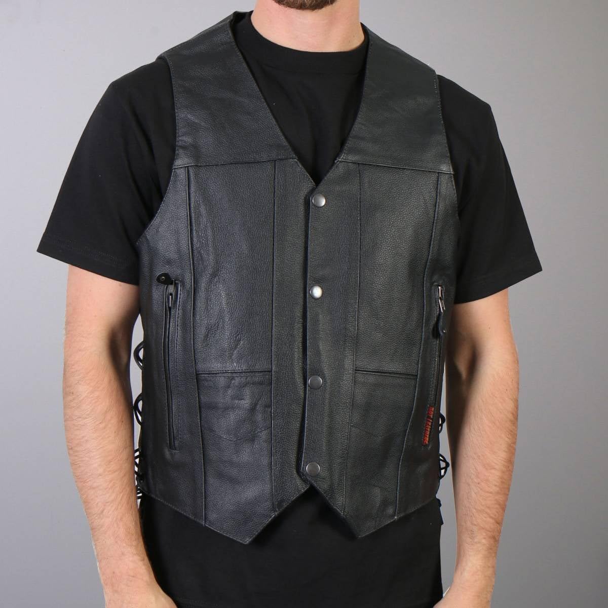 Hot Leathers VSM1034 Men's Black '10 Pocket' Cowhide Leather Vest Features Made of Top-Grade Cowhide Leather/li> Classic V-Neck Collar Classic Front Snap Button Closure Adjustable Side Laces for an Optimal Fit Satin lining Total of Ten Pockets 2 Outside Hand Pockets with Zipper Closure 2 Outside Coin Pockets Conceal Your Piece with Dual Inside Left and Right Storage Pockets (Can Be Used as Regular Pockets) 2 Inside Extra Deep Storage Pockets 2 Inside Regular Storage Pockets