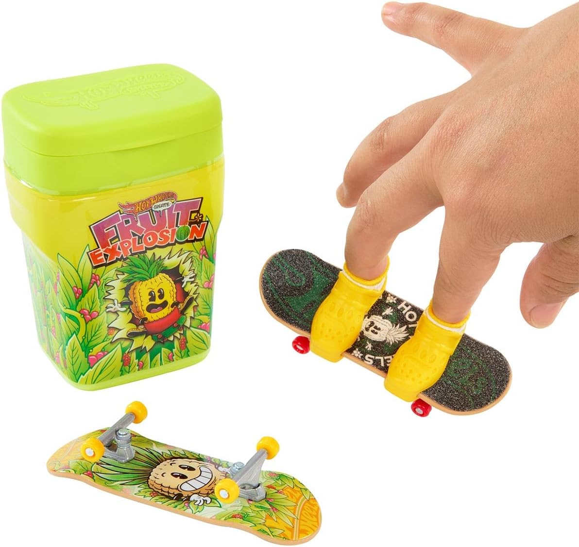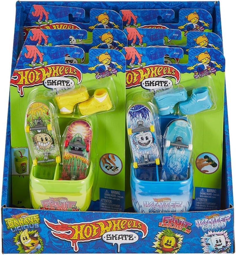 Take skateboards everywhere with the Hot Wheels Skate Flavor Container, which stores and hides 2 fully assembled skateboards and a pair of skate shoes in a bubble-like container. Open a "flavor" like "Bubble Blast" or "Snakeberry Sour" that is decorated with candy graphics and reminiscent of gummy packs. Inside, there are 2 exclusive boards and a pair of removable skate shoes with matching graphics and colors. These compact containers make skating anywhere easy and fun. With multiple "flavors" available, skate fans will want to collect them all. Each sold separately. Subject to availability. Colors and decor may vary.