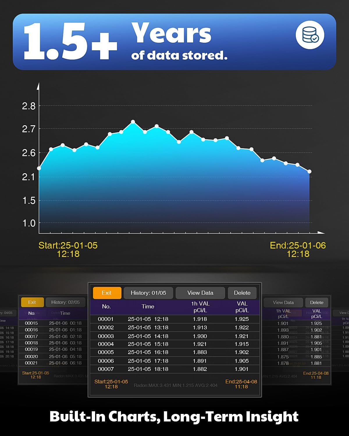 • Multiple Alert Modes: Color-coded bars intuitively display radon levels, flashing LED indicators combined with customizable audible alarms provide real-time warnings to safeguard your family's health