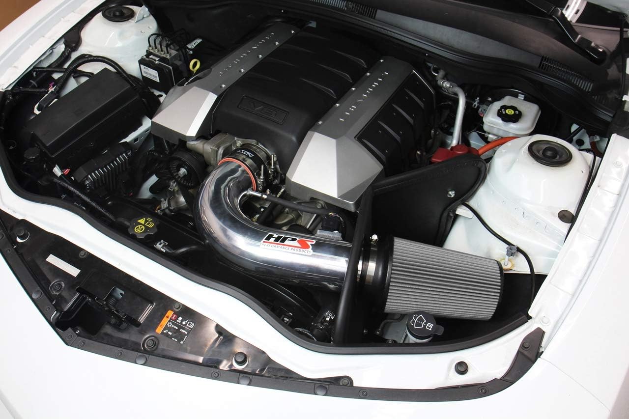 HPS red performance cold air intake with heat shield [part number 827-607R] for 2010-2015 Chevy Camaro SS 6. 2L V8 offers a free-flowing 4" mandrel-bent aluminum tube induction system designed to improve throttle response and produce dyno proven performance gains +13. 7 Whp horsepower, +14. 4 Ft/lbs torque while maintaining safe air fuel ratio. The heavy duty powder coated steel heat shield included in the kit blocks out the heat from engine and maximize the cooling effect. The included installation instruction has clear pictures and description to guide the installer throughout the whole process. The kit does NOT require tuning and no modification is required during the installation. HPS light weight 4" mandrel-bent aluminum alloy piping replace the stock restrictive air box and optimize the air flow with long lasting durability. HPS performance cold air intake kit features HPS signature race proven reinforced silicone hoses and industrial grade 100% stainless steel T-bolt clamps, which ensure the durability and reliability during the extreme driving condition. The All-New HPS Performance Air Filters are made in the United State and are designed with performance in mind, delivering excellent filtration without sacrificing air flow. Washable and reusable. CARB Exempt: No. Vehicle Application: 2010-2015 Chevy Camaro SS 6. 2L V8