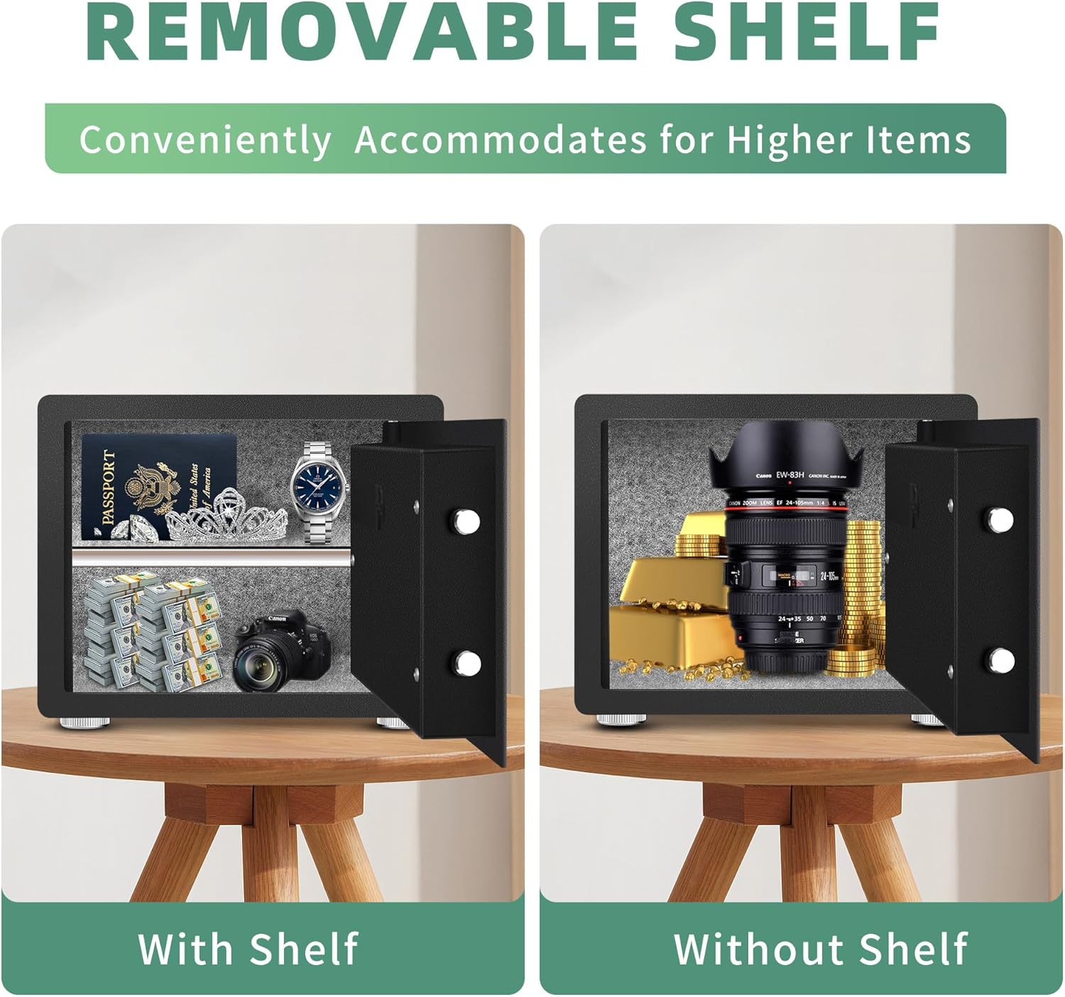 | Additional Features | Alarm System, Anti-Theft, Biometric Fingerprint, Combination Lock, Removable Shelf |