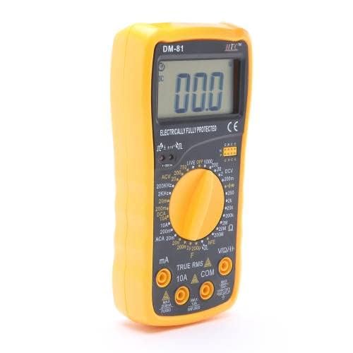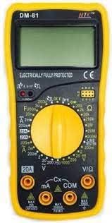 A multimeter or a multitester, also known as a VOM (Volt-Ohm meter), is an electronic measuring instrument that combines several measurement functions in one unit. A typical multimeter would include basic features such as the ability to measure voltage, current, and resistance. Analog multimeters use a microammeter whose pointer moves over a scale calibrated for all the different measurements that can be made. Digital multimeters (DMM, DVOM) display the measured value in numerals, and may also display a bar of a length proportional to the quantity being measured. Digital multimeters are now far more common than analogueue ones, but analog multimeters are still preferable in some cases, for example when monitoring a rapidly-varying. When testing the magnifying ratio of the transistor, turn the switch to the hFE position and connect the transistor to the eight-hole jack available in blue colour. For the Square wave output, the frequency is 50Hz, the voltage is approximately 3Vp-p. The output jack is “VΩmA” and “COM”.