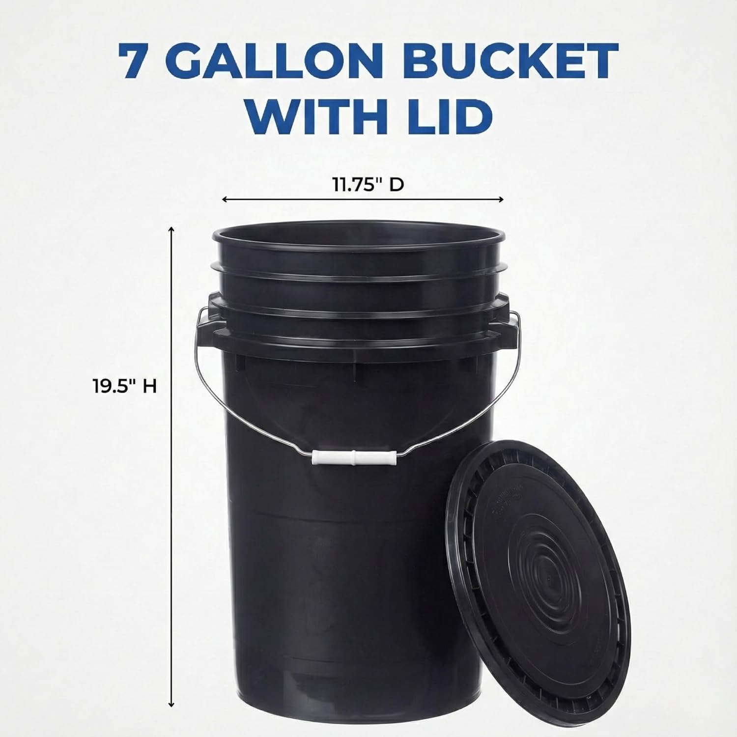 These 7 gallon Black HDPE buckets are extremely tough. 100 mil construction allow for these buckets to be used over and over again. Sturdy wire bail with a plastic handgrip is attached to the bucket. Practical fill is 7.00 gal. (26.50 liters) and overflow fill is 7.39 gal. (27.97 liters). Meets food grade standards. BPA free. Easy peel lid is included. 2 Pack. Made in the USA.