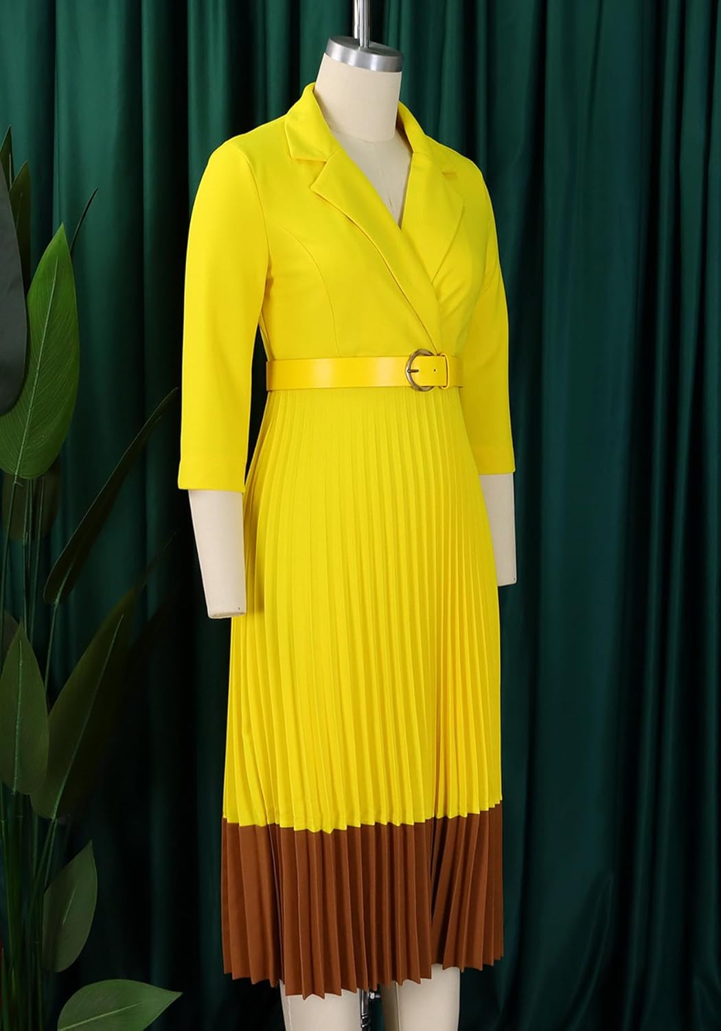 • Design: Work dresses for women 2025, lapel v neck, long sleeve with slit , tummy control, high waist, with belt, pleated dress, midi dress, patchwork color, elegant dress, dressy and casual