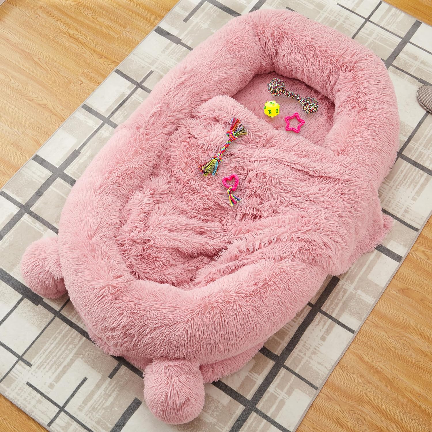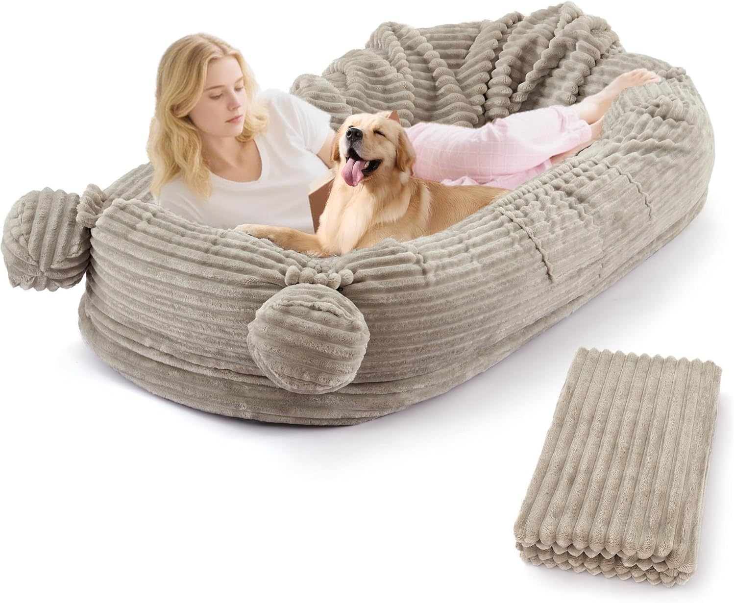 Relax in comfort beside your furry best friend with our Human Dog Bed for Adults — a premium indoor oversized pet mattress designed to bring warmth, relaxation, and connection. Measuring 71"x45"x12", this large human-size pet bed fits both you and your dog, allowing shared lounging and cozy naps together.Crafted with a removable faux wool cover, it offers a luxuriously soft feel and is fully machine washable for effortless cleaning. The matching blanket adds an extra layer of comfort during chilly days. Two side storage pockets keep essentials within reach — whether it’s your phone, TV remote, or your dog’s favorite toy. A built-in carry handle makes this portable dog mattress easy to move anywhere in your home.Designed with thick supportive padding, this comfortable sleeping pad provides stability and pressure relief for adults and pets alike. Ideal for living rooms, bedrooms, dorms, and pet-friendly spaces, this black pet bed combines modern aesthetics with functional design — perfect for dog lovers who want to relax together in style.
