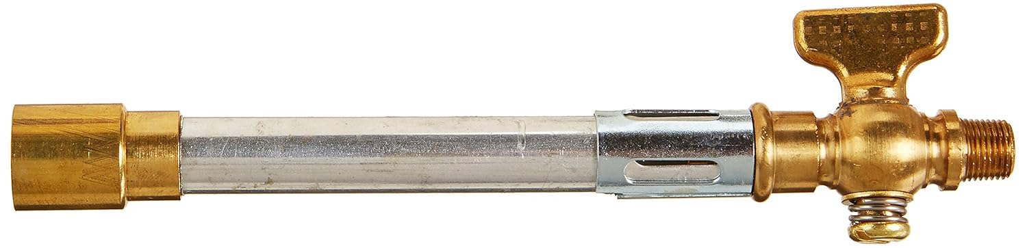 Designed for pipe mounting, this burner features a flame stabilizer and a stopcock for gas control. A 1/8" NPT nipple is mounted below the stopcock for pipe mounting.