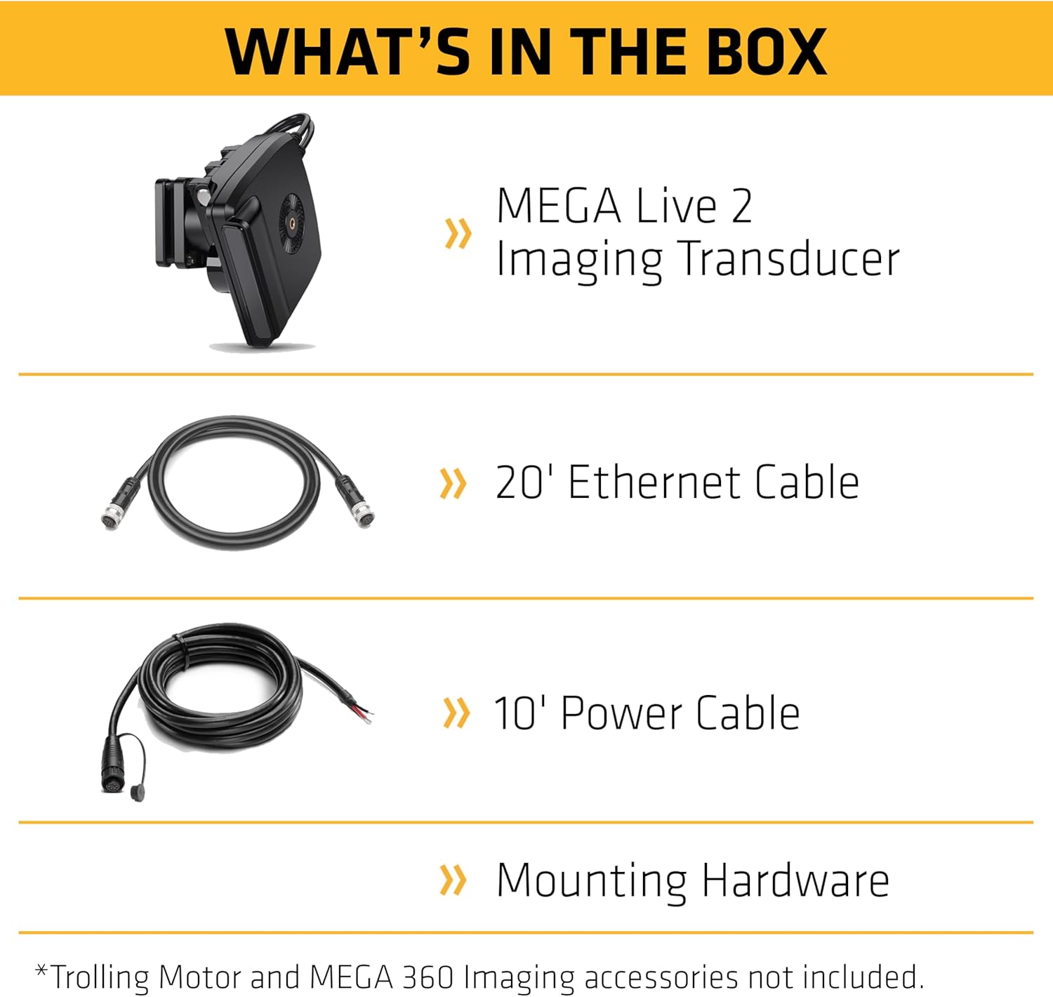 | Included Components | MEGA Live Imaging transducer; 20' Ethernet cable; 10' Power cable; Trolling motor mounting bracket |