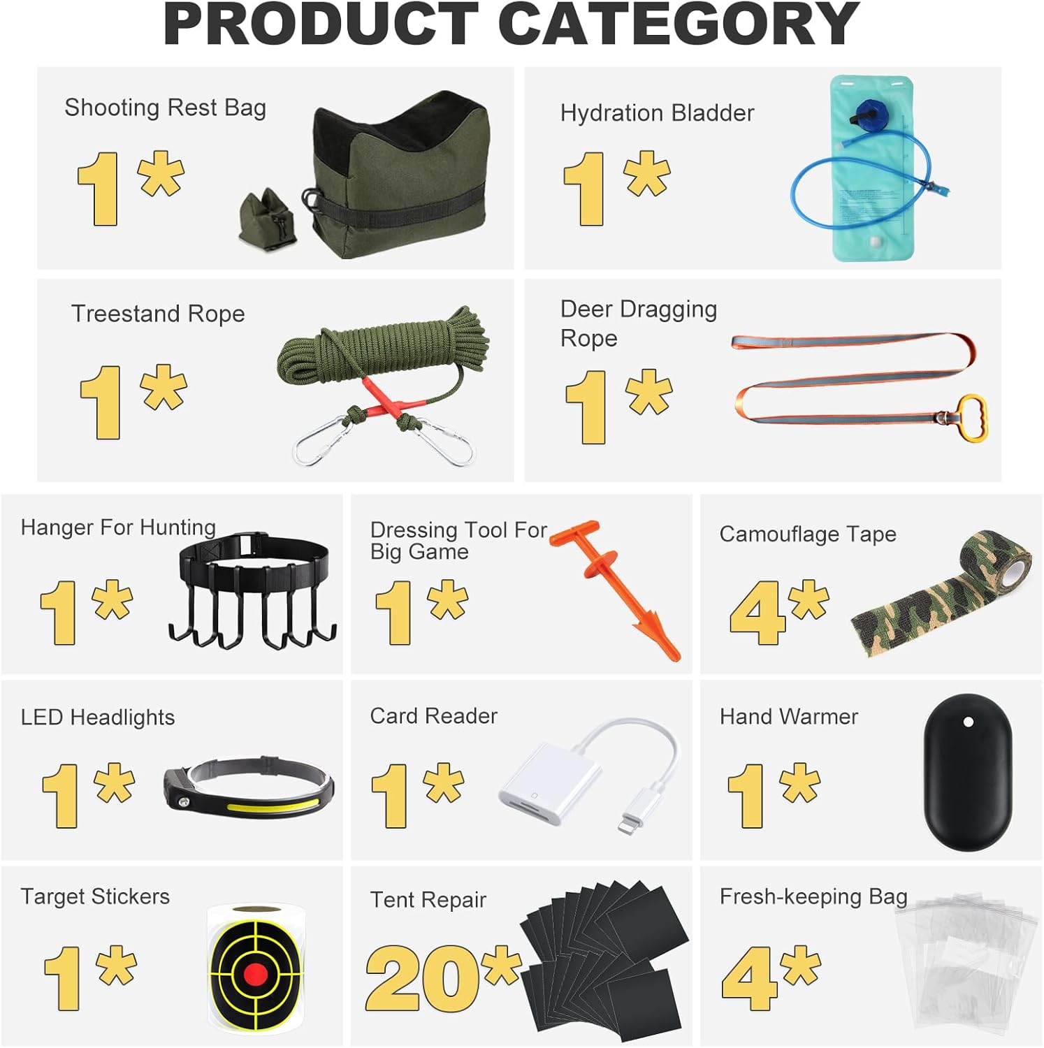 | Included Components | Camo Tape*4 | Hanger for Hunting*1, Dressing Tool for Big Game*1 | Tent Repair*20 | Treestand rope*1, Hand warmer*1 | Deer Drag Rope*1 | Card Reader*1, Hydration Bladder*1 | Fresh-keeping bag*4 | Led Headlight*1, Shooting Rest Bag*1 | Target Stickers*1 |