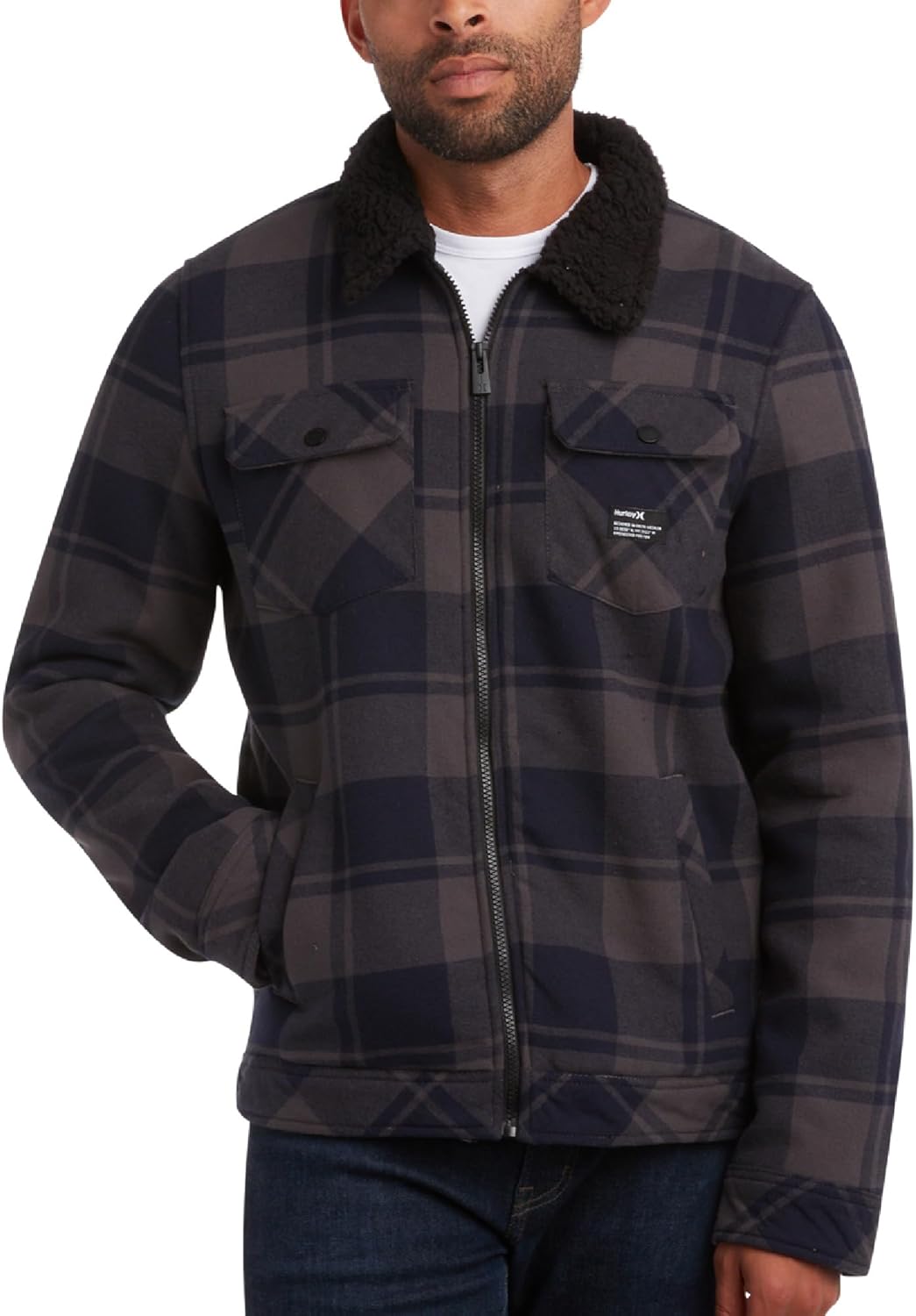 Experience the perfect blend of style, comfort, and warmth with the Hurley Men's Flannel Trucker Jacket. This classic plaid button-down shirt features a cozy sherpa lining, making it an essential addition to your cold-weather wardrobe. Crafted from durable 100% cotton flannel, this shirt ensures maximum comfort and durability. The bonded sherpa lining provides an extra layer of warmth, ideal for cooler days and nights. The full-length front zipper, combined with chest flap pockets with snap closures, offers a practical and functional design. Whether you're heading out for a casual day, a weekend adventure, or just layering up, this flannel trucker jacket has got you covered. Available in a variety of stylish colors and sizes, it's the perfect choice for men who appreciate classic fashion with a modern twist.