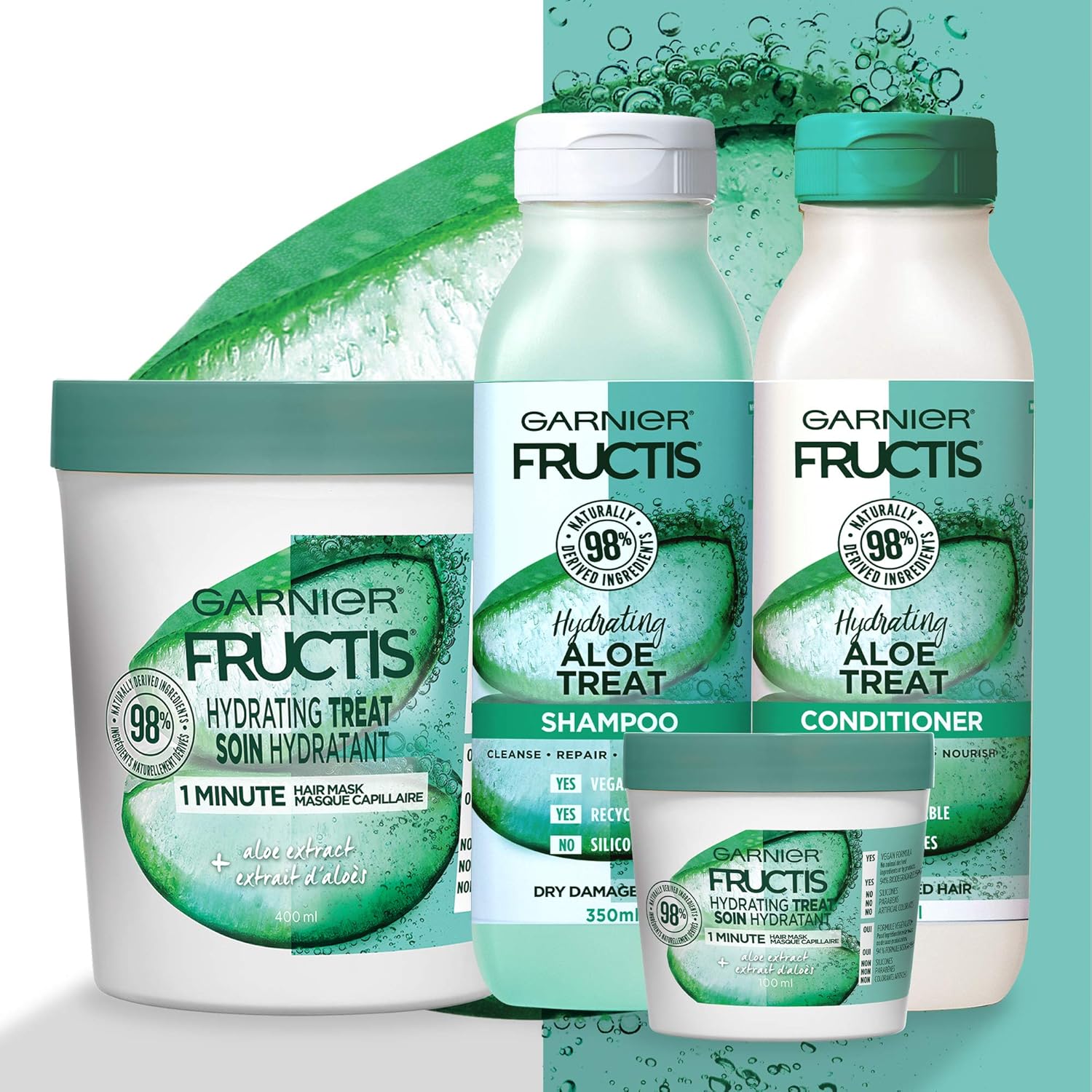In 1 minute, indulge your hair in a hydrating treat with 98% naturally derived ingredients*. Hydrating Treat 1 Minute Hair Mask + Aloe Extract helps you get soft, smooth, hydrated hair. No weighdown, no silicones, no parabens and no artificial colorants. Vegan formula with no animal derived ingredients. *We consider an ingredient to be naturally derived in if it unchanged from its natural state or has undergone processing yet still retains greater than 50% of its molecular structure from its original plant or mineral source. This formula consists of 98% naturally derived ingredients. The remaining ingredients constitute 2% of the formula to ensure its sensoriality and preservation. As a hair mask: After shampoo, apply onto wet hair and leave on for 1 minute. Rinse. As a conditioner: After shampoo, apply to hair from root to tip. Rinse. As a leave-in treatment: Apply on damp hair for hydration. Formula 1199955 B ,AQUA / WATER / EAU,CETEARYL ALCOHOL,GLYCERIN,ISOPROPYL MYRISTATE,STEARAMIDOPROPYL DIMETHYLAMINE,GLYCINE SOJA OIL / SOYBEAN OIL, PARFUM / FRAGRANCE, HELIANTHUS ANNUUS SEED OIL / SUNFLOWER SEED OIL,COCO-CAPRYLATE/CAPRATE,CETYL ESTERS,TARTARIC ACID,BENZYL ALCOHOL,CAPRYLYL GLYCOL,SALICYLIC ACID,SODIUM HYDROXIDE,LINALOOL,HYDROXYPROPYL GUAR HYDROXYPROPYLTRIMONIUM CHLORIDE,ALOE BARBADENSIS LEAF JUICE,CITRONELLOL,GERANIOL,COCOS NUCIFERA OIL / COCONUT OIL,VITIS VINIFERA FRUIT EXTRACT / GRAPE FRUIT EXTRACT,CITRIC ACID,POTASSIUM SORBATE,SODIUM BENZOATE, F.I.L.# D239318/1 Garnier is committed to continually improving the impact of its products throughout the product lifecycle, including the production and anticipated usage. This tool is designed to help assess the relative environmental & social impact of US Garnier Products compared to other L’Oreal Groupe products in the same category around the world in 2020. The calculation method was developed with the help of independent scientific experts and Bureau Veritas Certification, an independent auditor. The score takes into account 14 environmental impact factors all along the product's life cycle. Learn more about the methodology, here Overall environmental impact Compared to other similar L'Oreal Groupe Products sold worldwide in 2020 Carbon footprint 100 g(1) per average amount used (72 g per 10mL) Water footprint 5.5(2) per average amount used (7.8 per 10mL) Every consumer product has some impact on the environment. A good score here does not mean a product has a positive impact or no impact on the environment. The letters and colors used in this tool are designed to help you make comparisons to other similar products in L'Oréal's global portfolio, so you can make more informed choices. Manufacturing conditions Made in a responsible manufacturing plant Waste recovery: 100% Renewable energy: >99% Package facts % of jar made of recycled material (3): 0% Refillable or rechargeable: No Social impact of the product The ingredients and components of this product are sourced from suppliers committed to respect the fundamental principles of the UN on labor standards. 1 or more suppliers used in the making of this product are part of the L’Oreal Solidarity Sourcing Program. (1) Grams of CO2 equivalent ("conditioner & mask" category average = 108g) (2) Water index including water quality + water scarcity (m3) - "conditioner & mask" category average = 9.8 (3) Excluding pumps and/or caps Discover out evaluation methodology and all that we are implementing to reduce our impact together! Learn More How to use Fructis Treats 1 Minute Hair Masks Treat your hair to this creamy indulgence with 98% naturally derived ingredients. As a mask: After shampoo, apply onto wet hair and leave on for 1 minute. Rinse. As a conditioner: After shampoo, apply to hair from root to tip. Rinse. As a leave-in: Apply on damp hair for frizz control and lasting nourishment. Rich in Vitamins A, B, C, and E, Aloe’s hydrating properties make it a popular ingredient in skin care formulas that help to soothe and moisturize, and hair products that promote healthy shine.