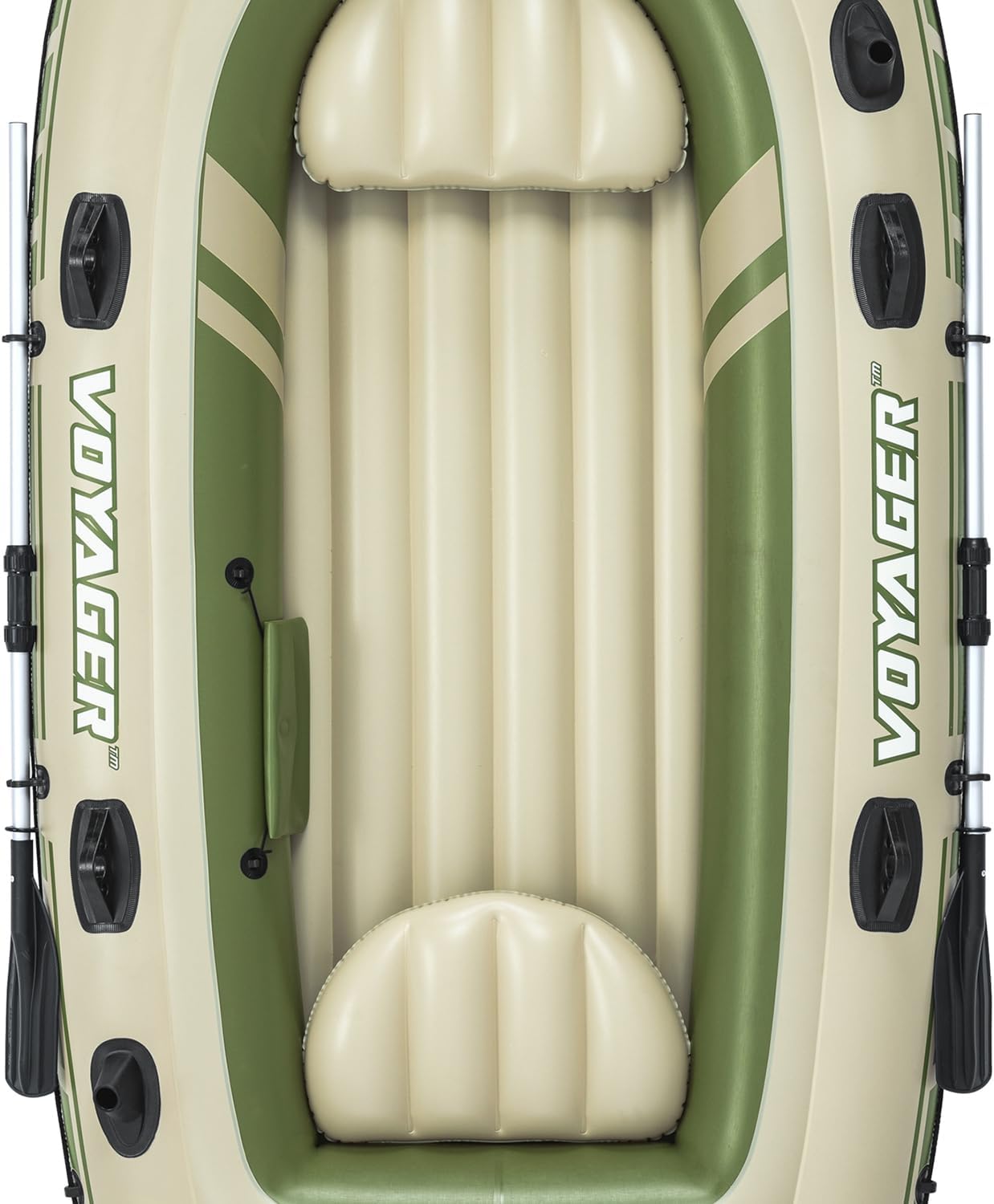 Gather your friends and get ready to ride the rapids with the Hydro-Force Voyager X3 Raft Set! Perfect for up to 3 adults, you can count on the durable material and convenient design to give you a safe and fun ride! Durable & Reliable Material: It’s easy to feel confident when you hit the water and navigate rapids because of the Hydro-Force Voyager X3's durable Inflata-Shield™ material. This special material resists puncture, limits stretching and enhances grip. You and your adventure buddies will be able to withstand the bumps and splashes of the journey with a material that gives you the extra grip you need. Oars & Added Features: The inflatable raft also includes built-in fishing rod holders and sturdy oarlocks so you can float and fish with ease. Guide your raft along the water with a pair of included oars and use the oar clasps to keep them in place. Comfortable & Compact Design: With inflatable seat cushions and an inflatable floor, you can enjoy an added level of comfort to make the ride more enjoyable. When you’re done, dry it off, fold it up and easily stash the Hydro-Force Voyager X3 Raft Set away in the carry bag until your next adventure!.