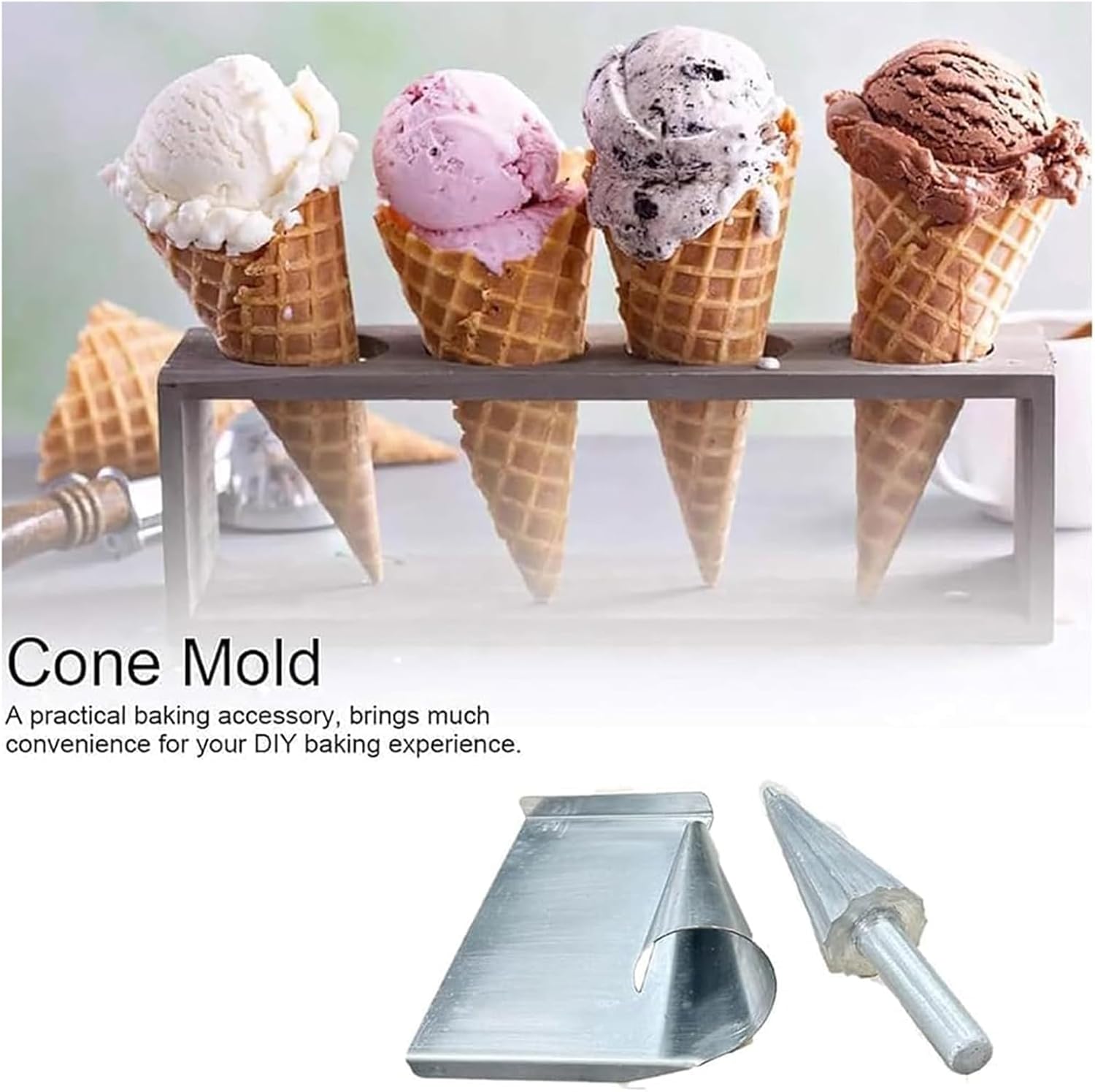 Specification: Product size: 260*195*100mm Net weight: 1.3KG Product size: 75mm*155mm Material: Stainless steel Gross weight: 1.5KG Handle size: 95mm Package Includes: Ice Cream Cone Roller Mold*1
