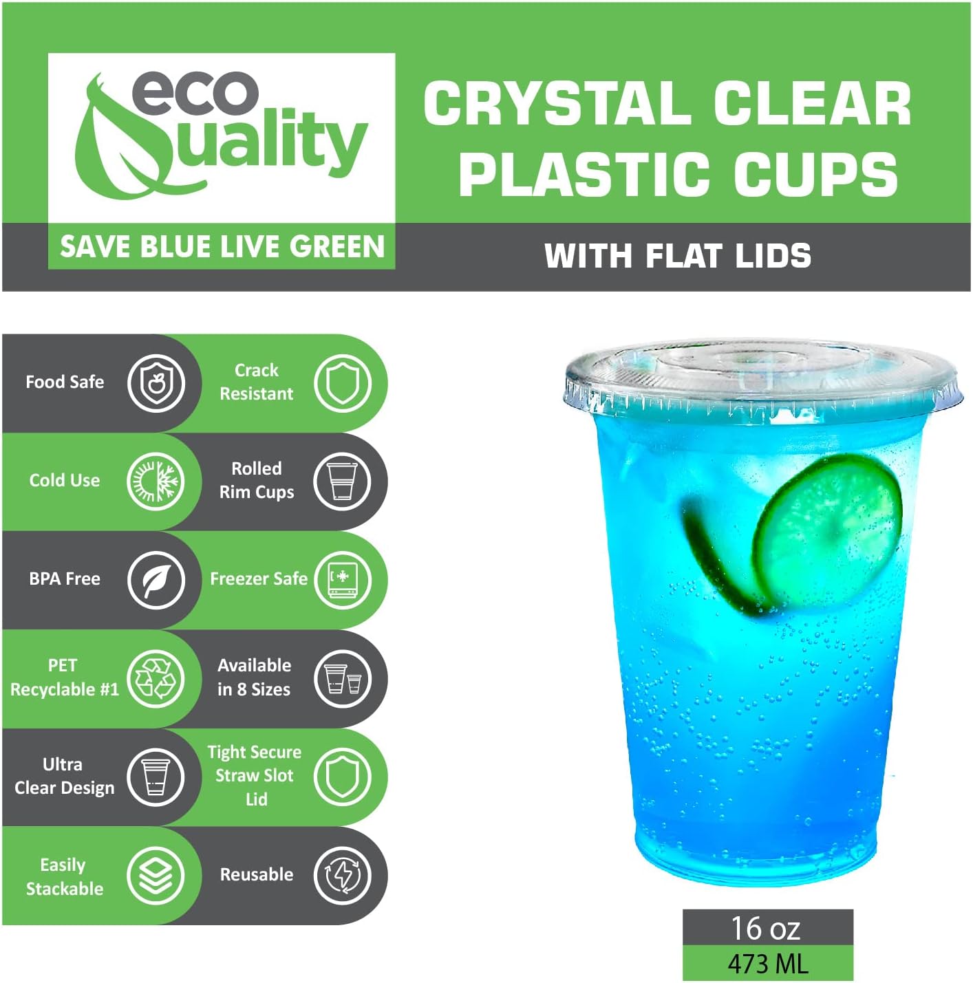 The EcoQuality Disposable Plastic Cups is perfect to fit in any establishment. They will come to your door in a 500 count combo packaging(500 cups & 500 lids) . Cold Drink-ware Measures at 16 ounce makes it big enough for a perfect travel cup. Durable clear plastic cup lasts a lifetime. Anti leak, anti slip, and comfortable. on the go, traveling, work, offices, parties, events, break rooms, or even at home. Amazing for after the gym protein shakes as well as smoothies. Utilized by most Bubble Tea / Boba Tea houses. These cups are 100% disposable. We strongly encourage you to recycle. STRAWS NOT INCLUDED