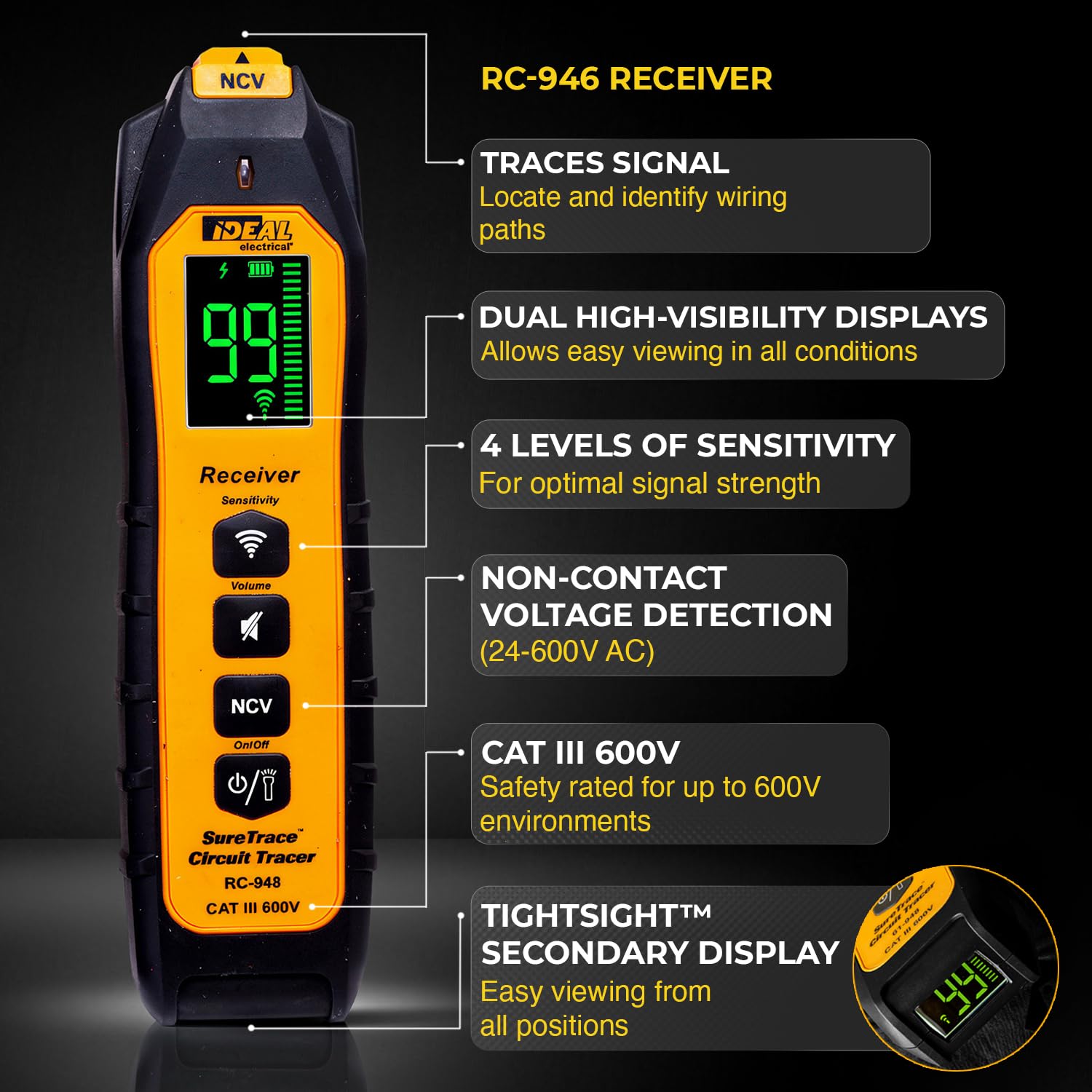 The SureTrace Plus Circuit Tracer provides fast and accurate breaker, conductor, and fault finding on energized/de-energized electrical systems, including 3-Phase. Leave your second tester behind and perform basic troubleshooting tasks using the transmitter’s patent-pending auto continuity tester, voltage indication (24 to 600V AC and 12 to 600V DC), and DC polarity indication features. Easily trace circuits and locate breakers in all positions and low-light conditions using the integrated work light and the receiver's dual high-visibility displays — a patented TightSight secondary display and 180° rotating main display. You can also check for the presence of AC voltage from 24 to 600 VAC usng the receiver's built-in NCVT. Troubleshoot without the need for a second person using advanced CertainCircuit technology that alerts you when the circuit is energized or de-energized at the panel and at the other end of the circuit. With a CAT III 600V rating, the SureTrace Plus Circuit Tracer is your fast, accurate circuit troubleshooting solution on both energized and de-energized systems.